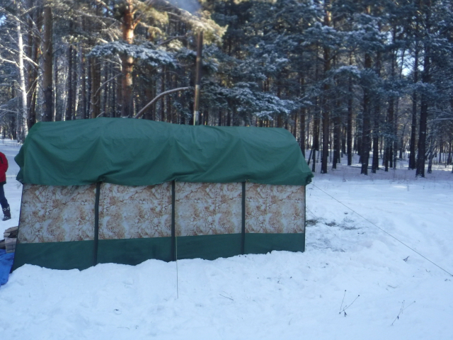 Субботний выезд в лес с баней без ночёвки. Снегу у нас уже достаточно, можно и поваляться. В 10 утра уже были на месте. Не торопясь, за полчаса расчистили снег и установили лагерь. Пока ещё тепло, на улице -10..-12 градусов.