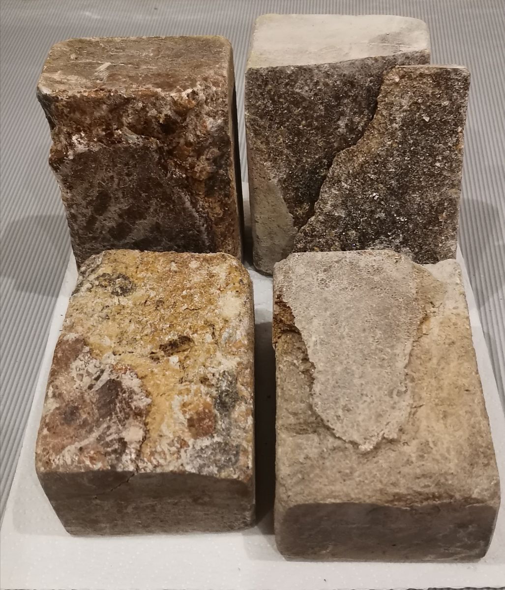 Использую попиленные кирпичи талькохлорита. Формат удобный, но камень достаточно хрупкий. Сильно покрошился, а некоторые даже треснули.