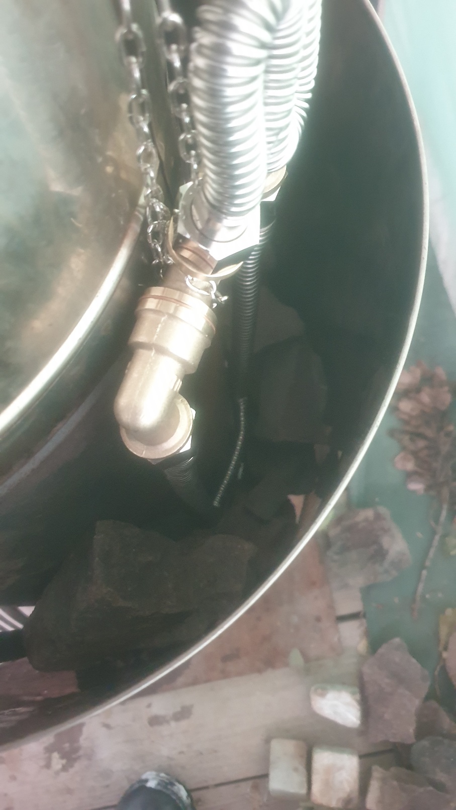 Имеем гофру около 70см, ещё одна на 40см, тройник, два уголка, немного) гаек из нержи, кружка LG (можно и что-то другое подобрать, просто я там работал)) и цепочка.