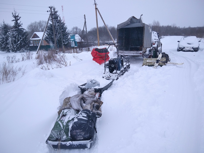 Надо сказать что за день до этого друзья на мотособаке со снегоуборщиком приезжали расчищать снег. И далось им это нелегко. Оттепели и отсутствие ночных заморозков сделали свое дело. Мотособака очень тяжело шла. Парни измучались и судьба выезда была под угрозой.
