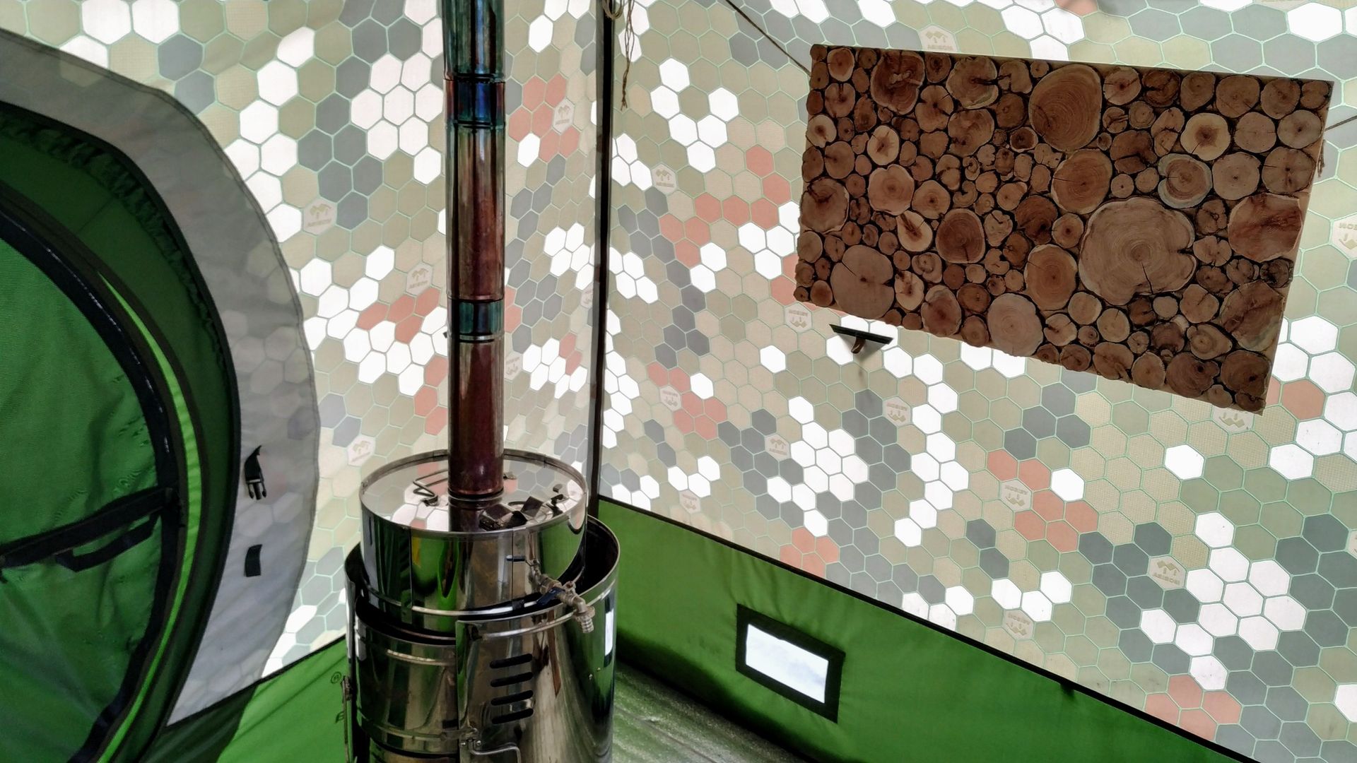 Повесил на растяжки за петли. Ткань боковины бани немного прогнулась, не критично, но в будущем, сделаю высокий деревянный каркас, поставлю на пол за печью.