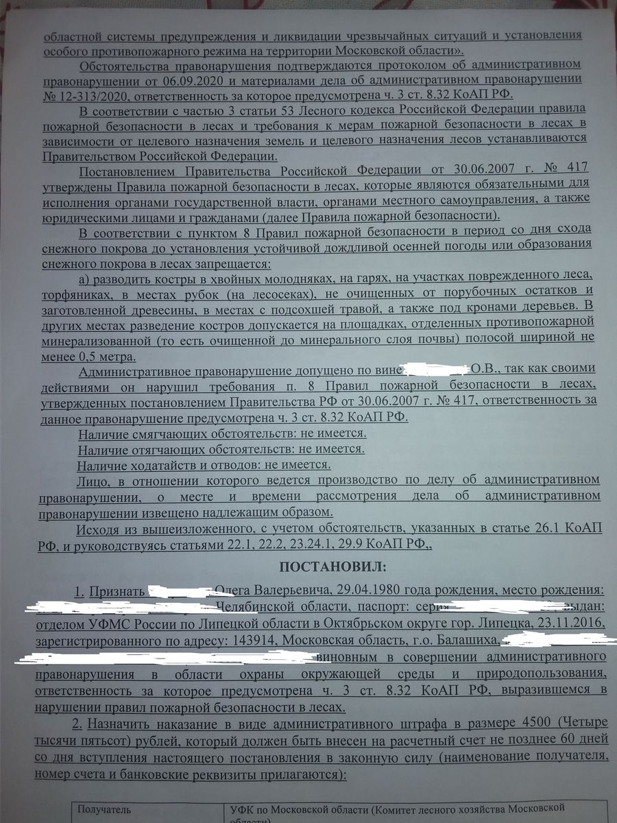 Ездил в Лесхоз в Ногинск на рассмотрение дела. Общался с инспекторами по поводу бани в лесу, на берегу. Задавал вопросы: как вы определили что я развел КОСТЕР под кронами деревьев? Ответ - по фото, мол вот тень от деревьев. А расстояния от КОСТРА до дерева? а диаметр ближайшего дерева? где в протоколе? Я объяснил, что спорить и идти в суд не собираюсь, но я ездил и буду ездить с мобильной баней на природу круглогодично. Что такое КОСТЕР? - это открытый огонь на земле? или горящие угли в мангале? или дрова в заводской сертифицированной печи? Нужно ли мне разрезать дно у палатки и окапывать банную печь на 50 см? В ответ сказали, что с банями они еще дело не имели, но из опыта судебной практики пояснили, что суд принимает за понятие костер любое пламя не важно где оно горит? Моль ставь баню подальше от деревьев и нужно иметь рядом ведро воды. В общем четкий ответ (пункт, статья, срок) по использование банной печи в лесу в противопожарный период я не получил. Выкладываю фото протокола, может кому пригодится для понимания наших законов. Есть еще видео в Ютубе, этот рейд снимал местный блоггер – активист, но там более часа и всего пару минут как они ко мне подходили (с 22 мин.)