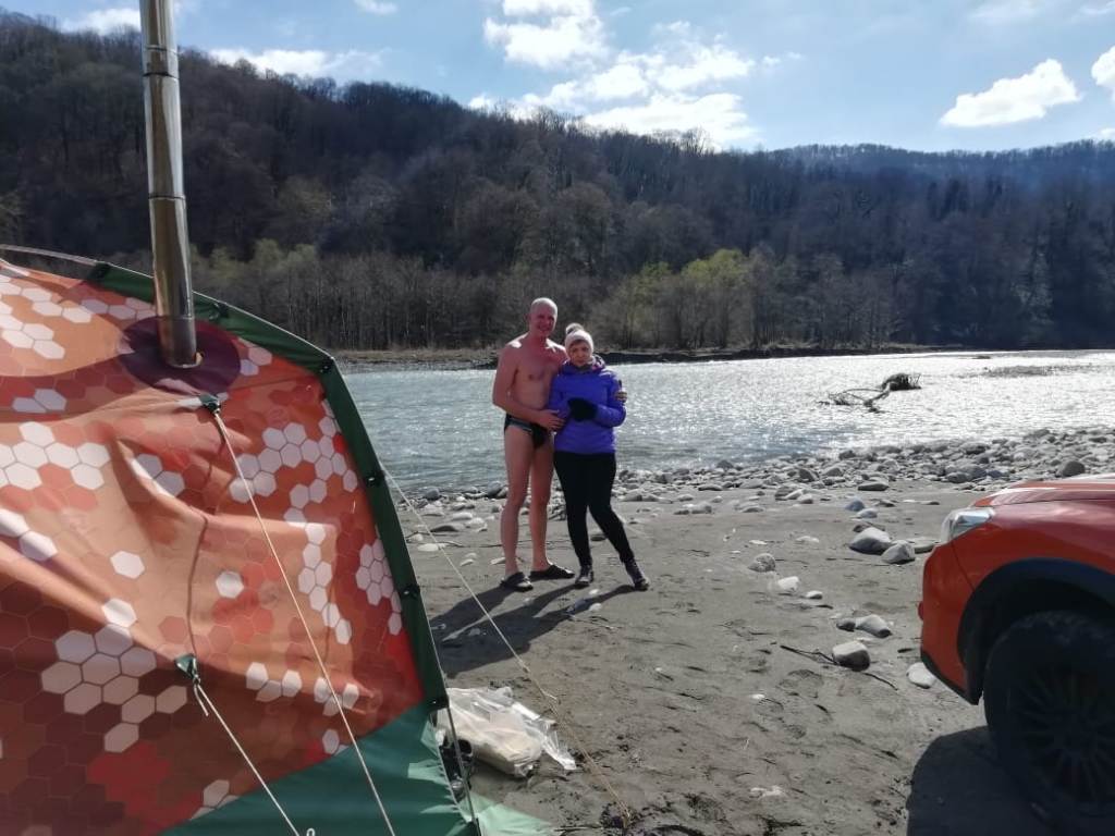 Наконец появилась возможность испытать долгожданную Кайфандру, заранее купленную еще в феврале, чтобы точно не пролететь с поставками к майским праздникам. Сходили на Волгу париться и купаться среди льдин.