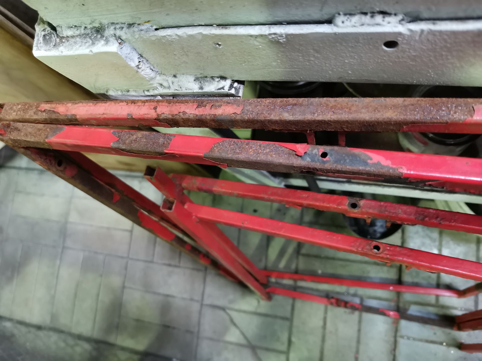 Всем доброго времени суток! Этой зимой решил отреставрировать свой первый полок ПС-700. Эксплуатировал я его нещадно, никогда не сушил и хранил в гараже, где влажность часто повышенная, поэтому выглядеть он стал мягко говоря не очень. А в бане все должно быть по фен шую )). Вообщем первым делом разобрал, высверлил все клепки, что не смог открутить так же срезал болгаркой. После чего все поверхности каркаса зачистил при помощи той же болгарки и металлической щетки - это самая трудоемкая часть процесса. Каркас решил покрасить порошковой краской, в той же компании где красим алюминиевый профиль для окон, красят они кстати совсем не плохо, но вот ценник выставили не гуманный 9т.р., я отказался. И тут товарищ по работе говорит, что он где-то не дорого будет красить раму от квадроцикла, я согласился. Цена вопроса 1000руб., качество конечно так себе, но по большому счету на несколько лет снова должно хватить. Весь крепеж решил сменить на нержавейку, у нас в Чехове ценник на нее скажу я Вам, просто не гуманный, так везде ??? Вообщем где-то в районе 2000 руб. вышел весь крепеж(болты, гайки, шайбы, тросик, клепки). Фанеру решил пока не менять, шлифанул и норм, я её уже третий или четвертый раз шлифую, так что это скорее всего был последний раз. Еще год должна простоять. Итого ремонт/реставрация вышел 3000руб. Ну и немного фото.