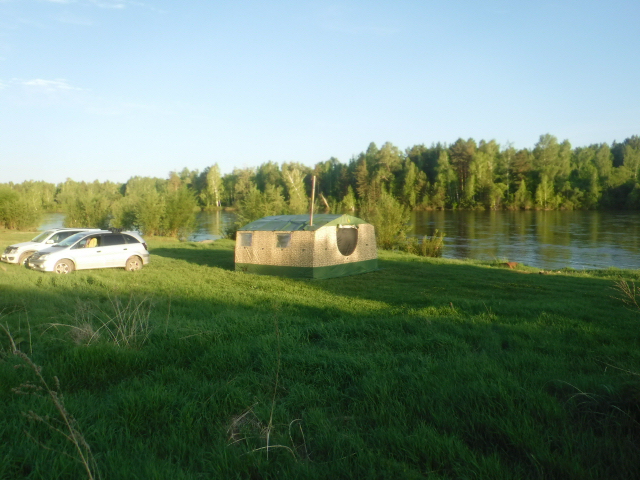 Р-436 в деле. Семейный выезд на реку с двумя ночёвками на двух авто. Всё раскисло от постоянных дождей, грязь месить не хотелось, да и ровные поляны для большой палатки на берегах нашей Белой найти не просто, поэтому встали под деревней Тюмень. Установили палатку за полчаса. Саня Петрович, извини, забыл сделать фото каркаса. Дети так увлеклись цеплянием крючков внутреннего купола, что пока я доставал фотоаппарат, они его уже установили. Следующий раз сделаю обязательно.