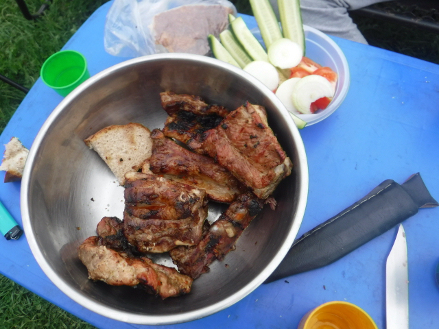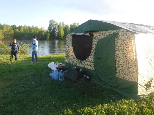 Р-436 в деле. Семейный выезд на реку с двумя ночёвками на двух авто. Всё раскисло от постоянных дождей, грязь месить не хотелось, да и ровные поляны для большой палатки на берегах нашей Белой найти не просто, поэтому встали под деревней Тюмень. Установили палатку за полчаса. Саня Петрович, извини, забыл сделать фото каркаса. Дети так увлеклись цеплянием крючков внутреннего купола, что пока я доставал фотоаппарат, они его уже установили. Следующий раз сделаю обязательно.
