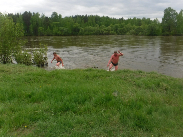 Подъём воды 2 метра. Где мы едем месяц назад в моём прошлом видео по каменистому дну, сейчас мощный водный поток. По воде периодически проплывают подмытые потоком деревья. Обустроили внутреннее пространство. Баню решили топить на следующий день, поэтому сразу установили 4 раскладушки, а на них надувные матрасы 200х150 см - получилось 6 полноценных спальных мест. Соответственно, печь МегаСогра, большой туристический стол и стулья - всё это вошло с запасом. На этих фото за столом, при готовых спальных местах, за столом свободно располагается 8 человек (к нам в гости посмотреть на чудо дом на берегу пришли знакомые местные рыбаки - дед с внуком). Однако ночью наша идиллия была нарушена. Белая не успокоилась на достигнутом и начала новый подъём воды. В 4 утра вода подобралась к самой палатке. Мы с товарищем сказали, что у нас ещё есть запас по раскладушкам, но наши жёны заверещали так, что мы вынуждены были подняться. Я успел перегнать наверх авто товарища, но мой Сузуки уже был отрезан. Ничего страшного, вчетвером мы перенесли палатку на возвышение, туда же перегнал свой авто. Однако женщины и, к сожалению, мой отпрыск, категорически отказались оставаться и двинули домой, забрав в попыхах у нас несколько нужных вещей, в том числе лодку с мотором. Здесь я вчера заезжал по сухому, но сейчас путь назад отрезан. Остались втроём, я, товарищ и его сын. К утру, как мы и рассчитывали, вода начала спадать и к обеду встала на уровень предыдущего дня. Мы втроём вернули палатку на прежнее место, сварили супчик, похлебали и затопили баньку. Пасмурно, лёгкий дождик, +14. При первом заходе в огромной парилке Р-436 (2х3,6м) было 98 градусов. Затем стабильно 90. Сделали несколько заходов с купанием в ледяной прибыльной воде. К вечеру пришёл зверский аппетит, и у нас было, чем его удовлетворить. Таз мяса, рассчитанный на шестерых, достался троим. Нашёл применение стойке от снеговой нагрузки в свободное от снега время. Получилась шикарная вешалка. Уже придумал куда приспособить вторую. Ещё несколько фото. Вечером пошёл дождь и шёл он всю ночь, но мы его даже не слышали, т.к. вырубились и спали до 10 утра. Планировали остаться до вечера следующего дня, но утром я получил печальное известие, что в верховьях Белой на рыбалке утонул мой товарищ.