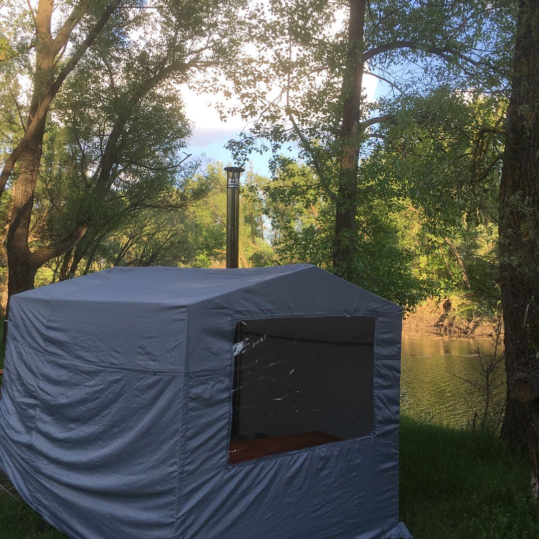 Сварил печь горизонтальную, без колосниковую, без искроуловителя (об искроотделении как и о мобибе я тогда не знал.) Поставили палатку , печь затопили и офигели как там было жарко, друг говорит6 "Тут как в бане". На следующий день я в ютубе в поисковик забиваю "Баня палатка", вылетают видео с полуголым накачанным бородатым мужиком с подписью "Мобиба". Так я узнал о платках и печах "момбиба" и стал фанатом "Мобибы". Посмотрев ролики я понял что денег есть только на материал, печь уже есть. Проблема встала с каркасом, фигня покупаю в метизном трубки из аллюминия, тогда я не понимал чем он отличается от д16т. И вот моя первая баня 2х3 с парилкой 2х3, сшитая на "зингер"
