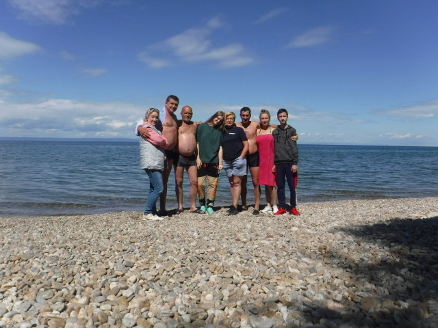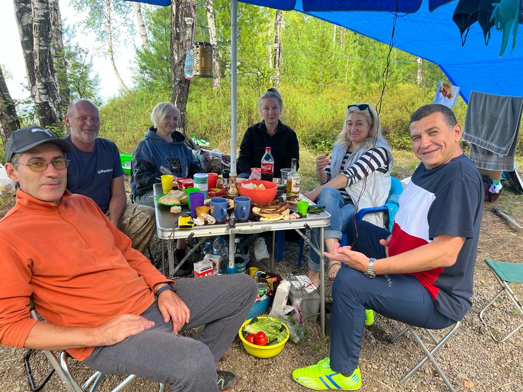 Вторая поездка в этом году была более основательной и с большим количеством людей. В Мурино много народу в августе, и мы смогли найти подходящую поляну для лагеря лишь в 2 км от заезда. В этот раз Байкал поразил чистой и тёплой водой. Никаких зелёных водорослей, спирохеты и спирогиры. Воду брали прямо с берега. Дно в ясную погоду просматривалось до 20 метров. А купаться можно было даже без бани - это редкость. Наш лагерь: В первый день нас было шестеро, и баню было решено сделать в Р-436. МегаСогра с этим легко и уже привычно справилась. Накупались до отрыжки. Пара небольших казусов. Во второй раз за 9 лет лопнул трос у полока в месте крепления, и трое сидящих на нём мягко грохнулись на тёплый пол Р-436. Привязали ветровой растяжкой трос и продолжили париться. Только больше двух уже не садились. Уже дома всё отремонтировал.