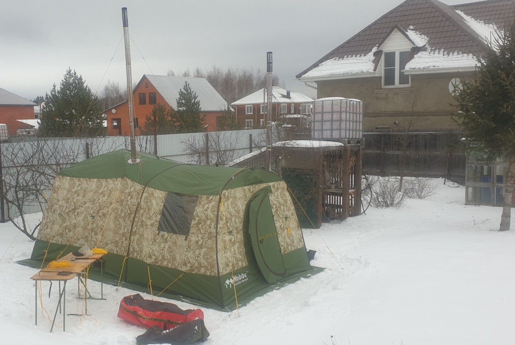 Ну что можно сказать? Замечательная связка! В любую температуру. При отрицательных температурах образовывался обильный конденсат в предбаннике. Приходилось Мега-Согру взбадривать для просушки) При этом температура в предбаннике была практически такая же как и бане))) Шучу конечно, но для комфорта пользовался такой замечательной опцией как москитная сетка на двери тента)