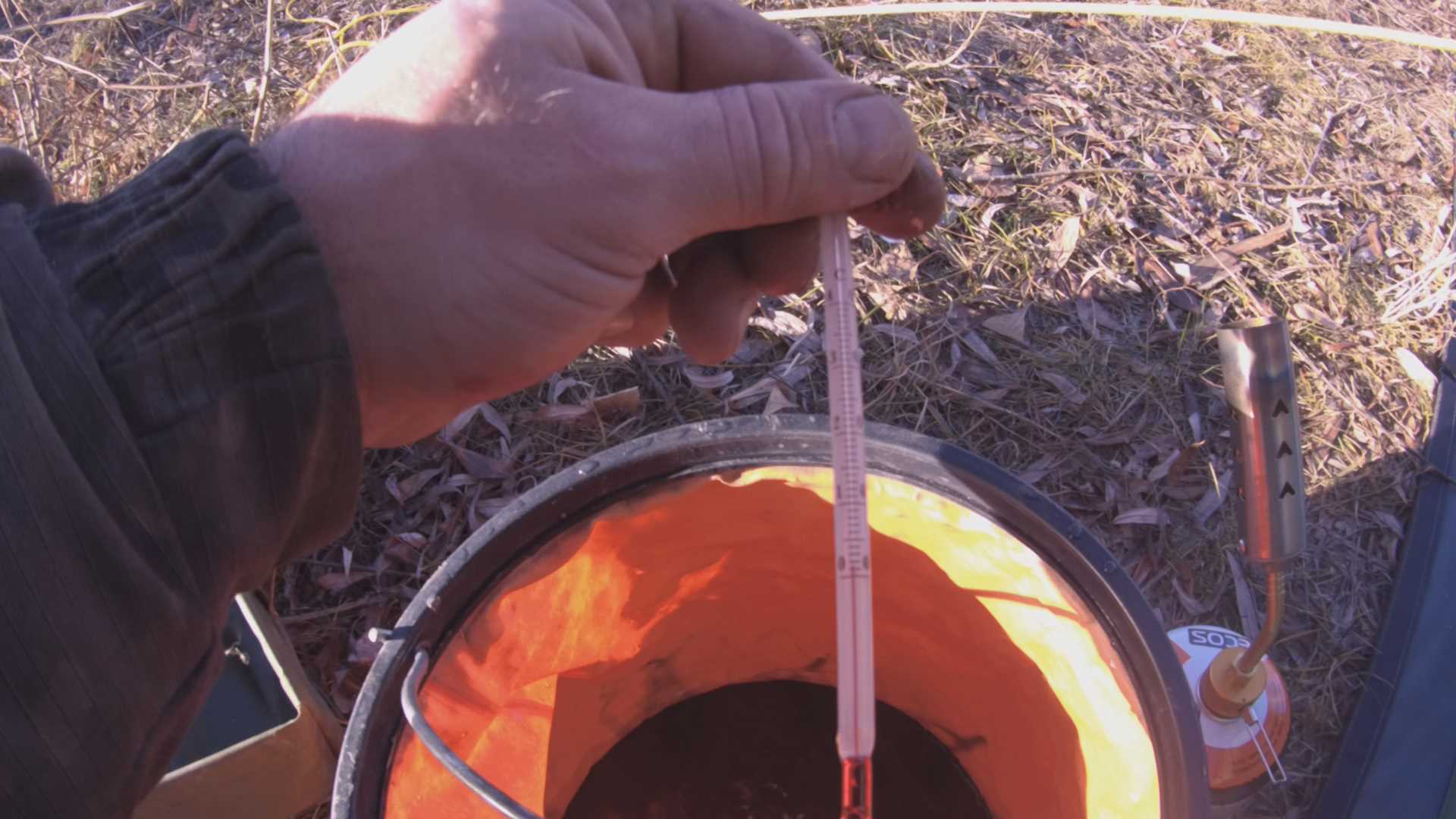 Когда жига выпарила бак воды, получился очень большой провал по температуре. Т.к вода ледяная, а брикеты не могут сразу дать нужное количество жара и ее вскипятить. Получилось прям брррр холодно, но были с собой просто дрова. Поэтому быстро замиксовал и поправил это положение.