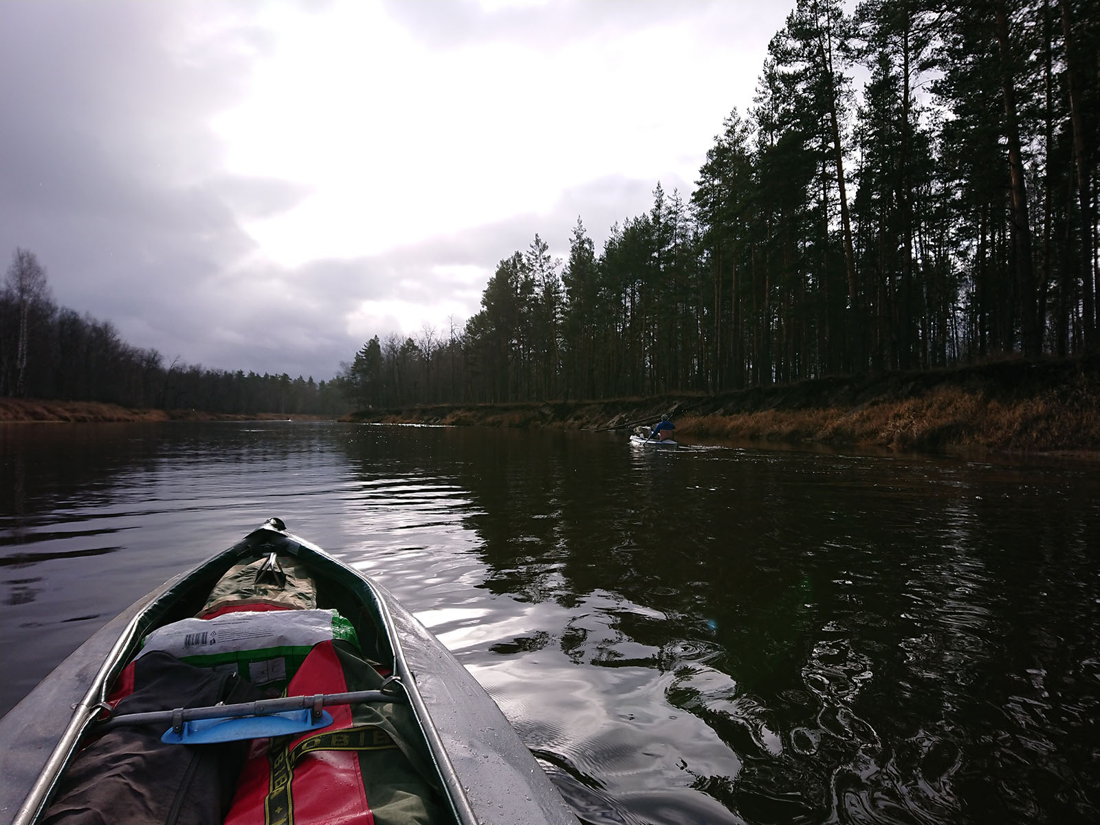 Кофе, собрались и стартанули. Иногда покапывало, но не напрягая, по доброму как-то, вроде как благословляя что-ли. Я брал с собой спиннинг, поэтому сразу отстал. Не особо переживал, т.к. все нужное для ночевки было впереди, у парней, у меня была баня. И пусть листвы уже нет, все готово к зиме, но как же кайфово сплавляться по осенней реке, прокидывая перспективные места воблером, никуда не торопясь, дыша этим воздухом. Тем более, что спиннинг взял в руки второй раз за год.