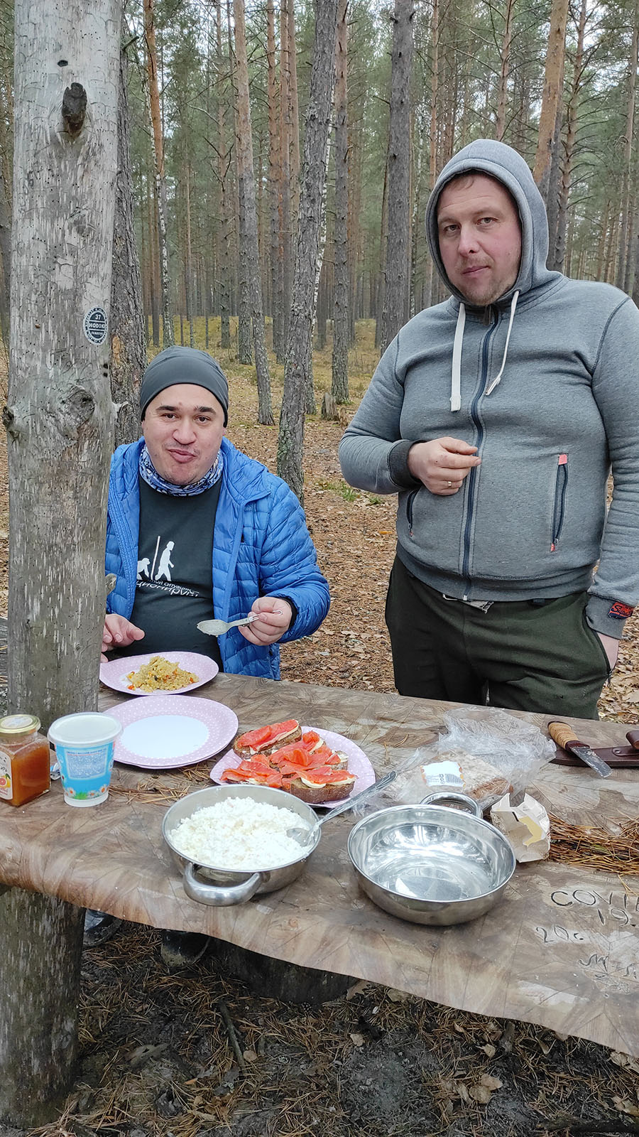 Около полуночи выгрузились на берегу, при свете фар и фонарей поставили жилую палатку (МБ-15+ТН-15), склад (МБ-10), отпустили машину, перекусили и спать. Всю ночь моросило, но это нисколько не испортило нам настроения на утро. На завтрак Леха долго и вдумчиво резал малосольную форель, мазал хлеб сливочным маслом, и никто его никуда не торопил...