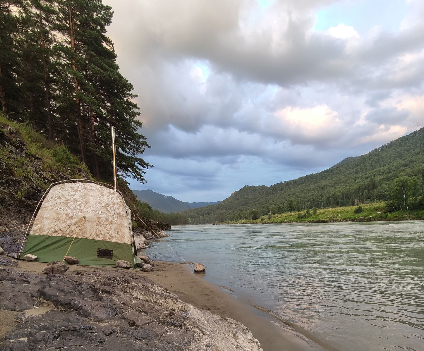 Был удобный спуск к реке Катунь, и что весьма удачно, при том, что она имеет быстрое течение (да и в целом, опасная), возле это базы был натуральный мини-заливчик с хорошей глубиной и песчаным дном, удобно для купания. Так как дело было в июле, то вода в Катуни была не очень холодная, но и не теплая, как и полагается для купания после бани, в меру освежающая (иначе в теплой воде после Мобибы недействительно!)