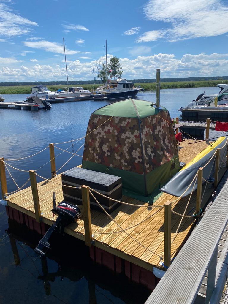 Баню ставим на плот, крепим штырями в щели между досками либо веревкой к перилам. Место - яхтклуб Юрмала, река Лиелупе. Можно отплывать, тогда все как дома (никого вокруг).