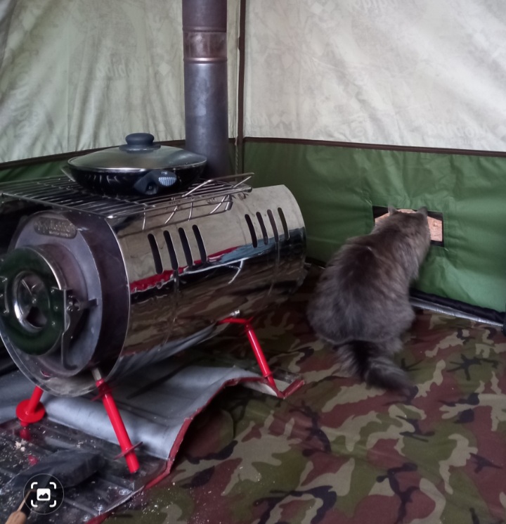Так вот, несколько брикетов кинул - жарко, едрит-кудрит. Что ж, давай приглушать подачу воздуха в дверце. Может, конечно, давление не то на улице было, и погода не та, но либо слишком жарко, либо начинает деготь там течь и дым как бы обратно просачиваться, в обоих случаях дышать нечем. В общем, ворочался, ворочался, ворочался. В итоге, в час ночи встал и пошел со спальником спать в лодку.