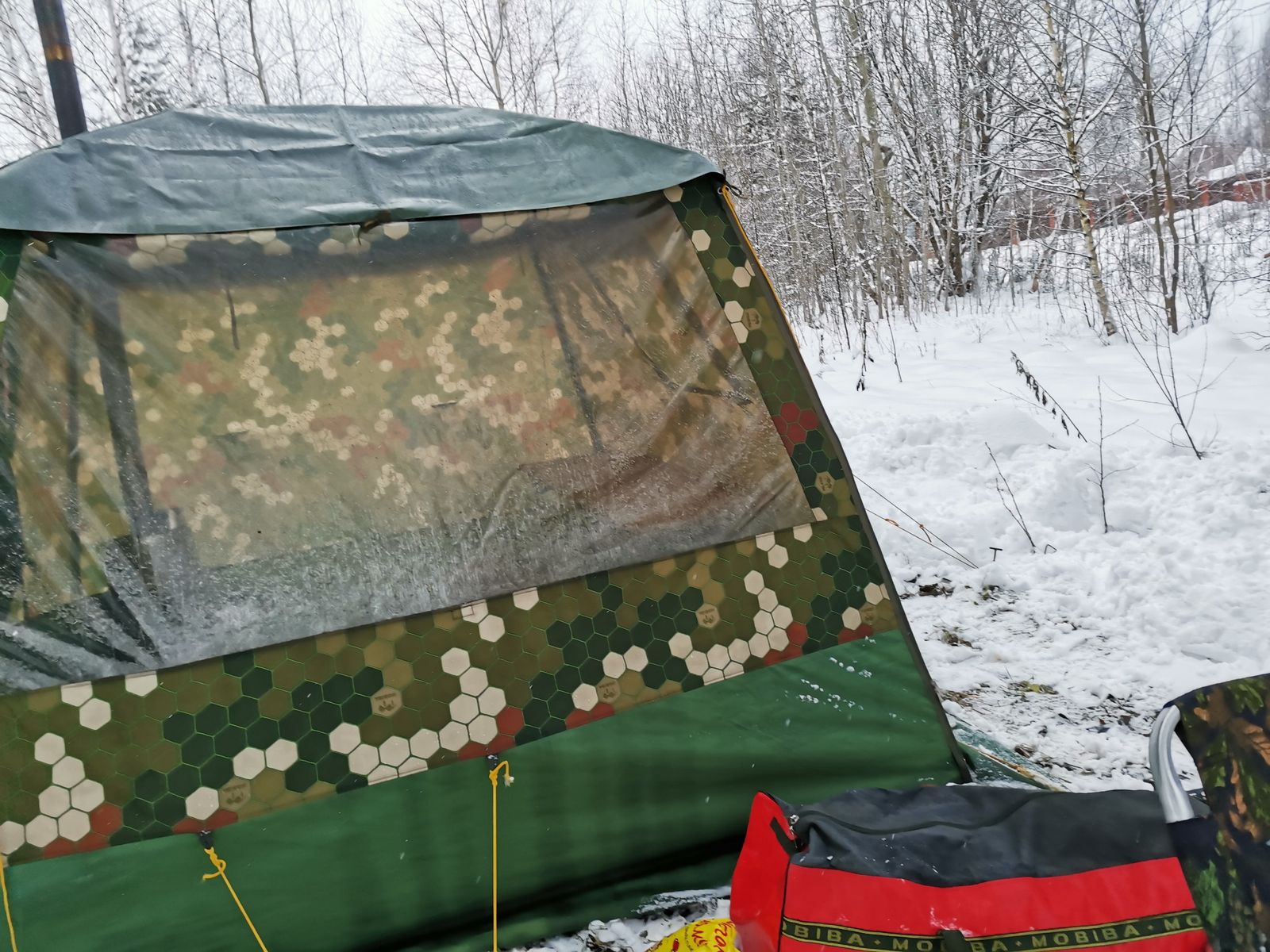 2. Ночуем зимой в однослойной палатке (вместимость 5-6 человек с вещами, вес 5 кг, с титановой походной печкой 7кг) которую шили сами (по типу палатки зима, но с уменьшенной шириной до 3,6 м (обычно 4,2). В это раз в нее ставили Согру (наследие нашего турклуба, которая 1-й раз используется за 4 года:), брикеты горели практически всю ночь в режиме тления, только под утро подкинул дров для увеличения температуры внутри палатки. Температура ночью была -15. Внутри по ощущениям +5, +10 в зависимости от расстояния до печи (но у нас спальники зимние пуховые). Согра понравилась, тем, что ненужно ее кормить дровами постоянно (но как походную яб не стал ее использовать-тяжелая)