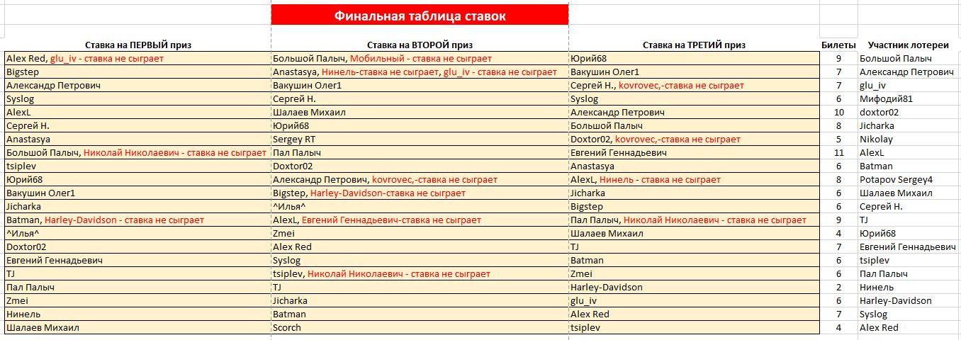 *Респект-ставка, - сделанная ставка на участника, на которого уже сделана ставка кем-то другим. Может ставиться сознательно, в качестве проявления уважения. В таблице отражена красным цветом, так как материально в розыгрыше не участвует и приз не получит. Респект-ставки были выделены в таблице с самого начала, чтобы у поставившего было время ее поменять.