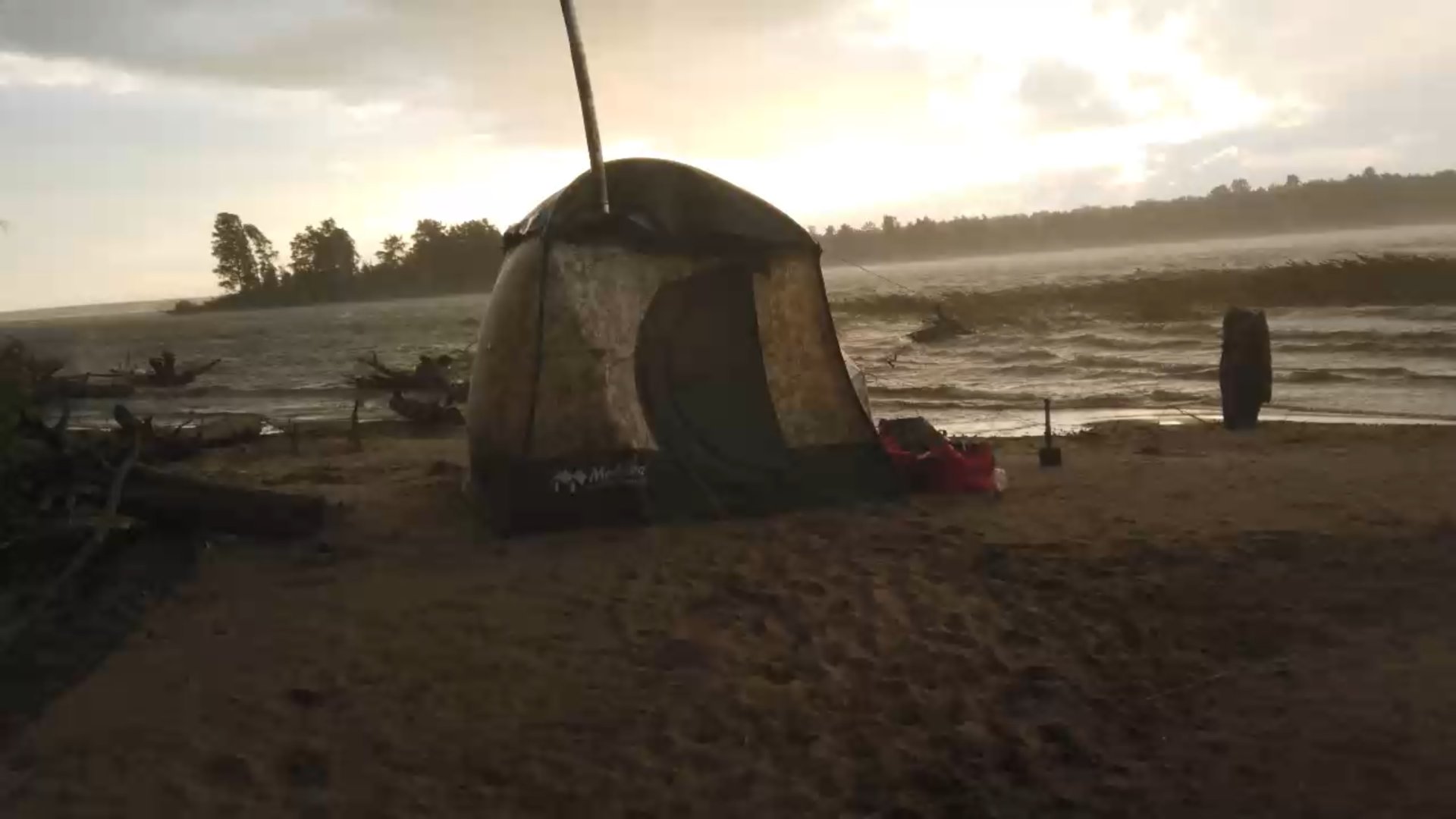 внутри постелили березовый лапник отдыхали мы на острове неделю. середина июля. и однажды вместо жары погода преподнесла сюрпризы в виде прохладной и пасмурной погоды. у кого-то настроение, может быть, и подпортилось - но только не у участников данного "похода" - банька просто зарешала! а еще к вечеру и разыгрался "лёгкий" ветерок, но Мобиба справилась (кадр из видео)