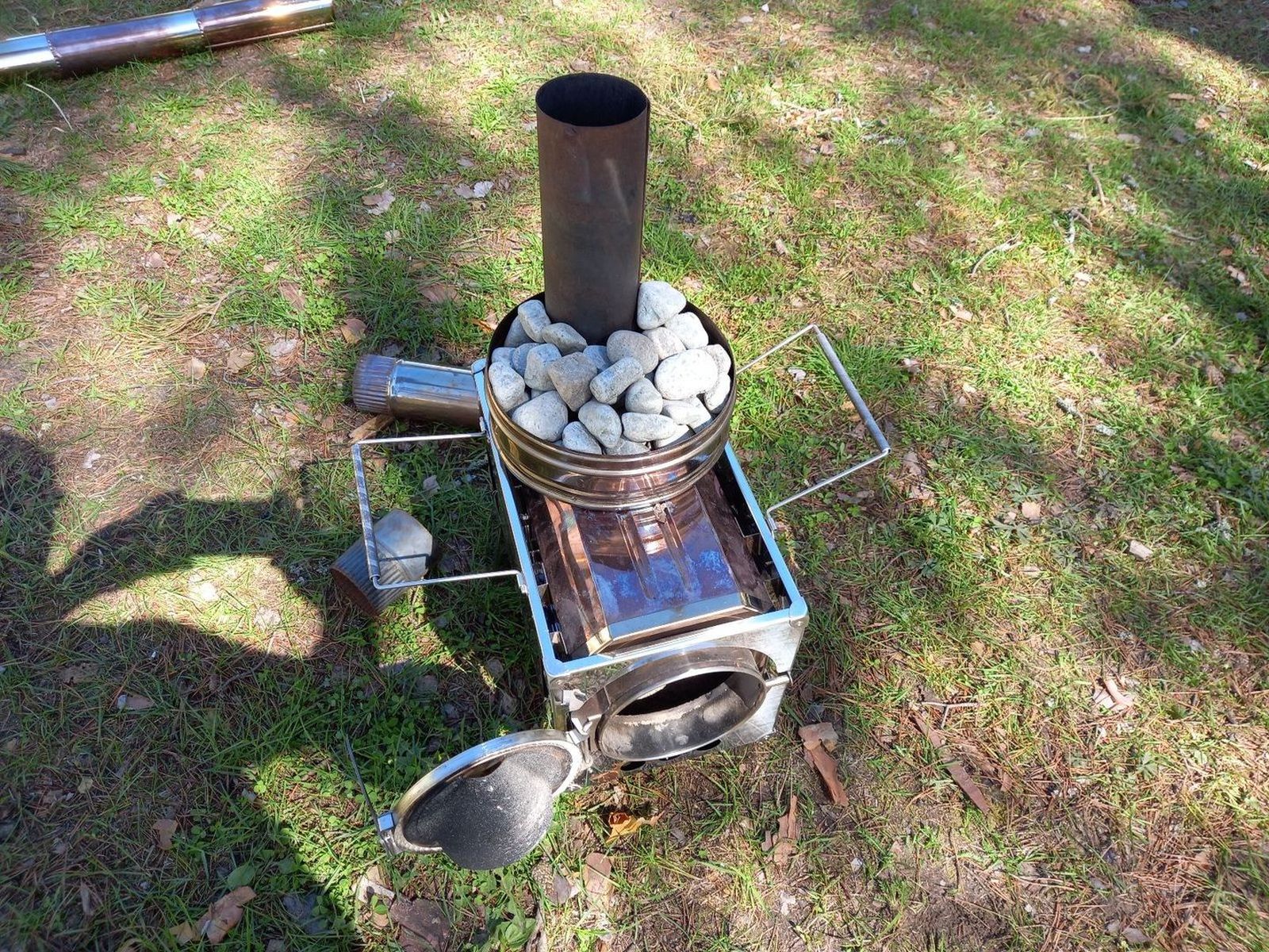 Сергей,у тебя более правильный девайс,у меня эконом вариант. Труба на Печи Дюна в твоём исполнение отдаёт максимум тепла на камни,более быстрый нагрев,экономия топлива. Кто будет использовать девайс от Жиги,окуратней лейте воду,что бы внутрь печи по трубе не попало на дрова,из за этого баня у нас закончилась через полтора часа. Ещё хотел использовать шляпу от ППГ-90,но там мельче камень нужен. В варианте который использовал в бане,вес 10 кг жадеита,и то не весь вошёл. Первое фото.
