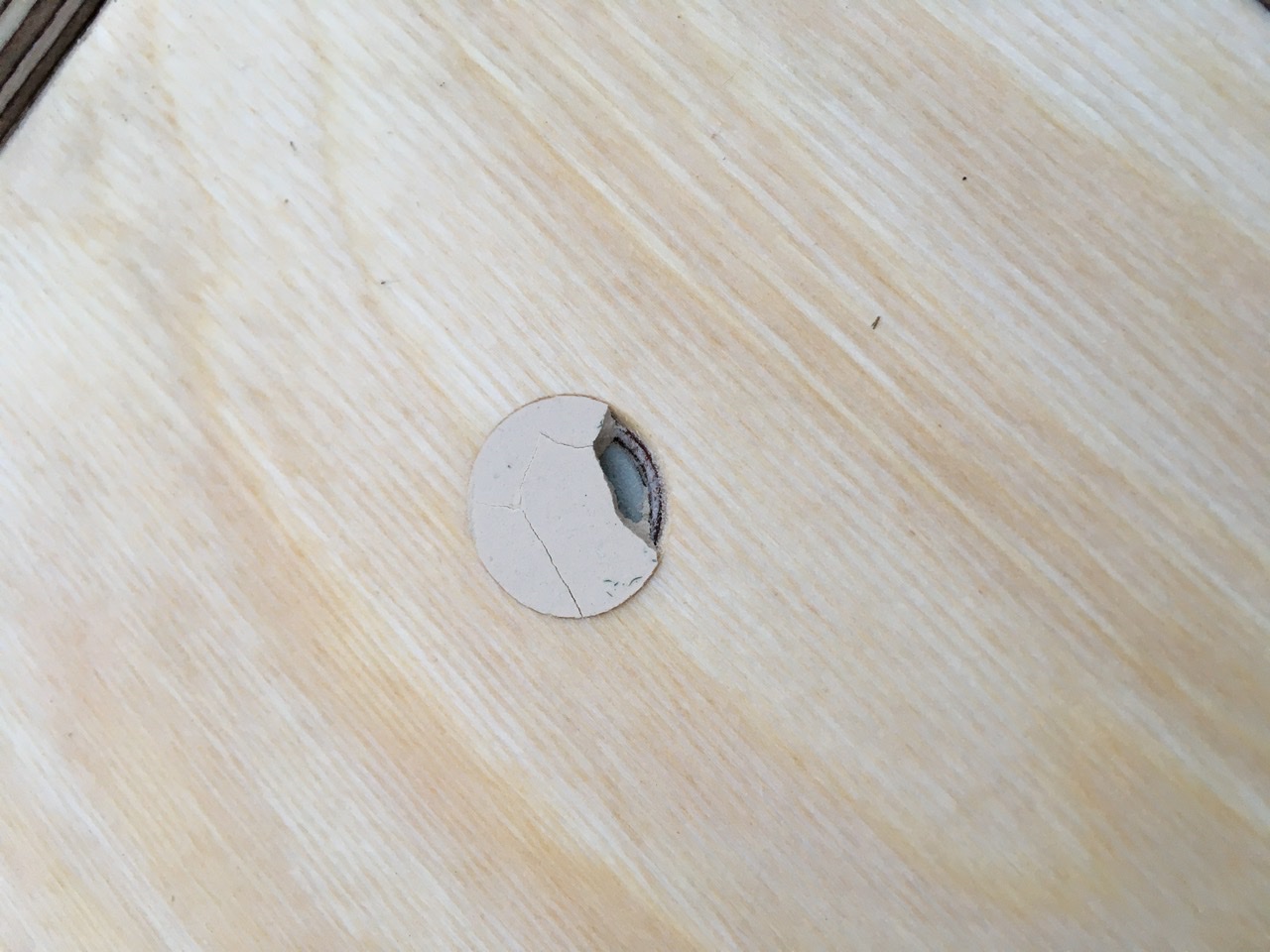 Я бы, как советовал Евгений Геннадиевич, спилил бы замятый угол. Фанеру полка пропитал бы маслом для банных полков. У меня так и сделано. Заглушку шпаклевкой по дереву можно восстановить. У меня они все повылетали почти. Я не заморачиваюсь. Стелю на полок всегда туристический коврик пенку. Комфорт возрастает в разы, а на полок влага практически не попадает. Есть коврики-матрасы. Снизу оксфорд, сверху текстиль, внутри наполнитель искусственный. Очень удобные коврики. Сохнут замечательно. Очень советую.