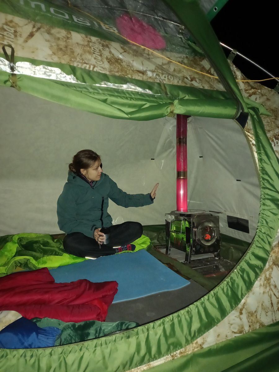 на этих выходных тестил к6 с печью жига-2. Блин все таки внутреннее пространство в к6 как бани мне даже больше нравится чем в к5, но эта дверь, вот прям даже лишний раз не хочется выходить, возможно это дело привычки. На улице было 7-8 градусов тепла, ветер, все как положено. Поставил к6 в нее жигу-2, сразу полный бак воды, два топливных брикета, если больше, то у меня получался эффект обратной тяги и "пыханья" печи. Печь вышла в крейсерский режим и 80 градусов на уровне плеча держит, но печь нужно подбадривать. За счет низкого потолка паровой пирог опускается ниже, чем в к5 и в общем и целом прокачивает жига на все 100% и даже, на мой взгляд, лучше чем к5, нет такого явного градиента температур верха и низа. Очень сильно сомневался, что жига по высоте не пройдет, но нет все четко встает и от сопла до крыши около 15см остается и, самое главное, сопло направляется вдоль длины палатки и при входе выходе пар не шпарит в лицо. Просто у меня в к5 вечное проблема куда направить сопло, обычно по диагонали палатки и при входе мимо струи пара пройти не получается, а разворачивать в заднюю стенку, сыкотно, что ткань испортится. Так, что испытано, жига качает К6!