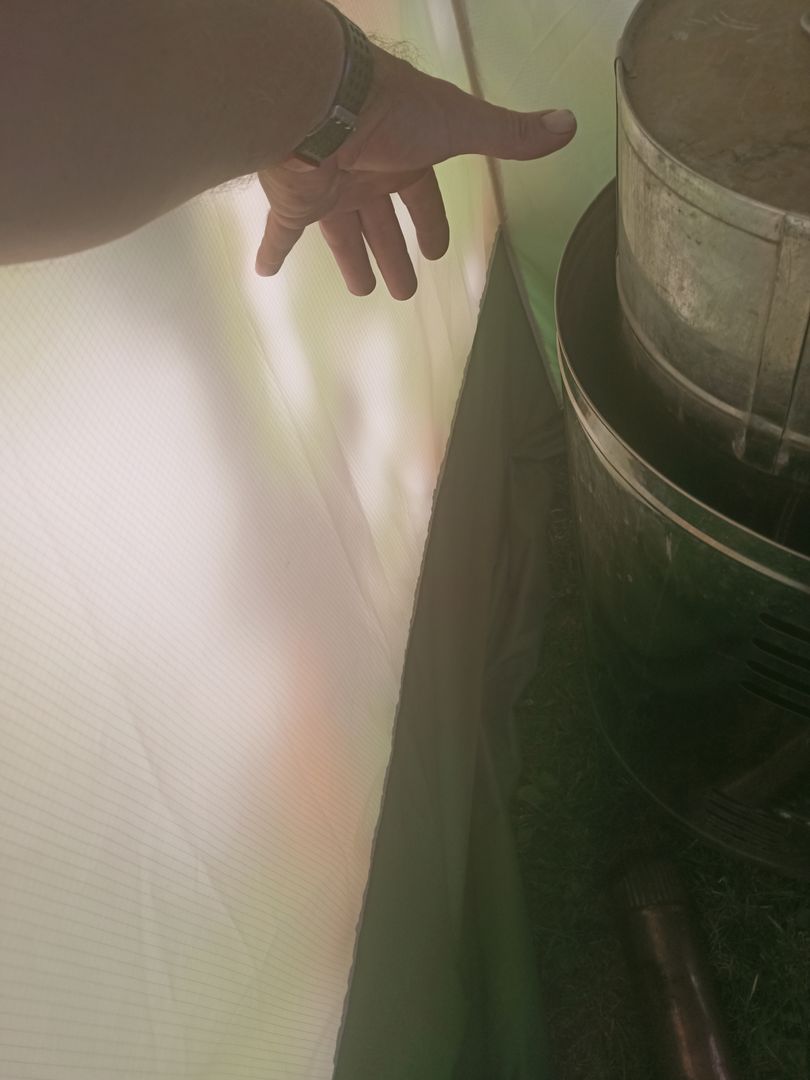 Расстояния по полу от проекции центра проходки до левой стенки где-то 40-50 см (вверху 20 см),а до передней стенки палатки около 35-40 см. Но у меня палатка стоит на участке, который немного с уклоном, поэтому проекции могут содержать ошибку отклонения от горизонта (вертикали).