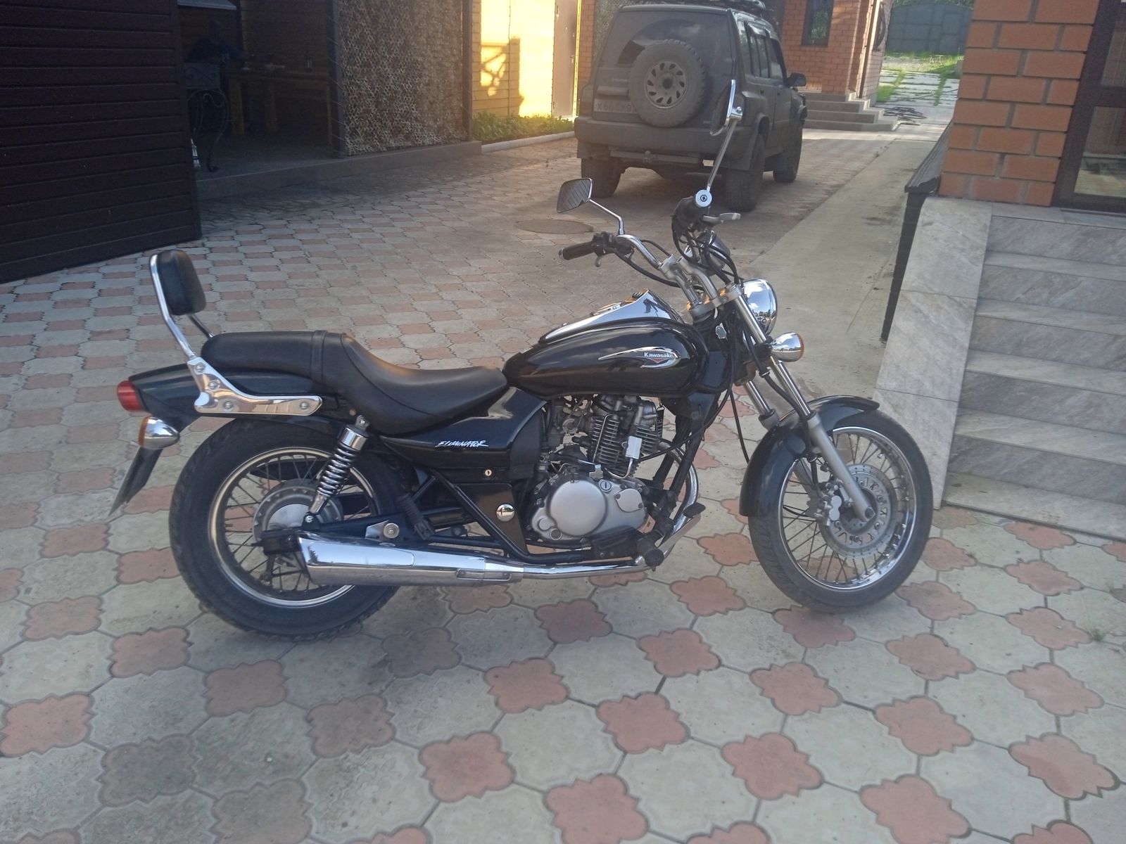 Малыш чоппер-круизёр Кавасаки 125 кубиков. Взял по цене новой Альфы. Для своего объёма едет очень неплохо. Но самое главное - очень удобно сидеть - седло широченное, ноги вытянуты вперёд. Сразу вспомнил Илью на Альфе и свою прошлогоднюю поездку в Красноярск за эндуриком Сузуки, на котором больше 100 км за раз было уже тяжеловато. Здесь за 400 км останавливался только раз заправиться.