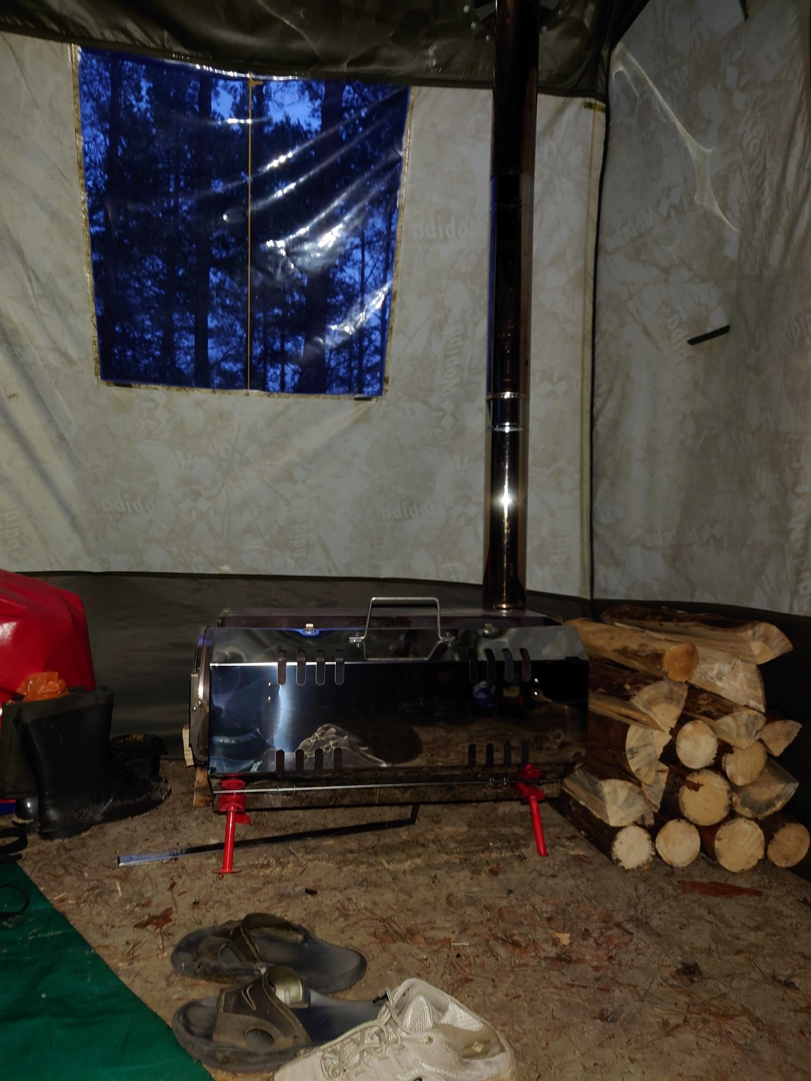 Забросились вечером 2 ноября, буквально за 15 минут перетащили на стоянку за 150 метров все наше барахло от канавы, которую газель не могла преодолеть геометрически). Поставили лагерь, поужинали и спать. Мегасогры хватило на 8 часов, ночью раз проснулся как будто от хлопка какого, и сверяя утром ощущения, вроде как пахло дымком несильно и недолго. Вероятно снова конденсат капнул с трубы в печь. Оставшиеся ночи открывал заслонку посильнее, и мне на полке 700 мм спальник был не нужен