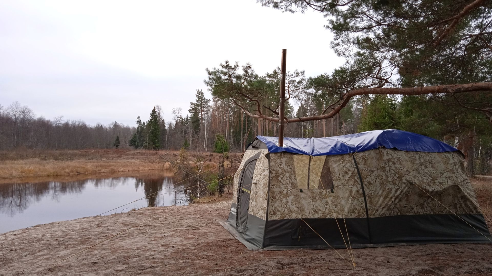 Забросились вечером 2 ноября, буквально за 15 минут перетащили на стоянку за 150 метров все наше барахло от канавы, которую газель не могла преодолеть геометрически). Поставили лагерь, поужинали и спать. Мегасогры хватило на 8 часов, ночью раз проснулся как будто от хлопка какого, и сверяя утром ощущения, вроде как пахло дымком несильно и недолго. Вероятно снова конденсат капнул с трубы в печь. Оставшиеся ночи открывал заслонку посильнее, и мне на полке 700 мм спальник был не нужен :) , подкидывать приходилось через 6 часов.