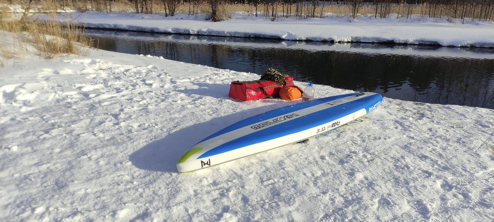 Доброго времени суток. У меня случился однодневный выезд. Решил я поплавать на Supчике, да не просто поплавать, а в баньку на нём сгонять. Собрался заранее в пятницу и с утра в субботу рванул. Я уже брал баню на Sup в сплав по Керженцу, было здорово. А сейчас ещё снег кругом лежит - красота. День выдался замечательный: солнце, снег, ветер, штиль, опять солнце. Маршрут не сложный. Сначала тащим всё до воды примерно метров 400 в два захода, потом плывём 4 км против течения. Далее паримся и возвращаемся обратно.
