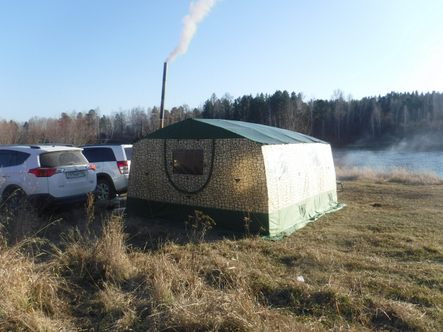 После октябрьской поездки на Байкал с Денисом Диастелhttp://www.mobibaforum.ru/post81938.html#p81938 буквально через неделю Р-436 выступила в роли небольшого банного ресторана для проведения Юбилея моего друга. Просто была такая просьба с его стороны - именно так, на природе, с баней справить 50-летие - необычно и чтоб запомнилось. Р-436 не подкачала, и своим функционалом и шикарным внешним видом вполне соответствовала задуманному мероприятию. Всё получилось замечательно, всем очень понравилось! Баня топилась весь световой день, а двое ребят вообще парились в Мобибе впервые и впервые окунались в реку в конце октября! Всего нас было шестеро. Сидели до 3-х ночи. Ночевали с тёплым полом трое на раскладушках, трое на надувном матрасе 2х2 м. Все прекрасно выспались и никто не замёрз.