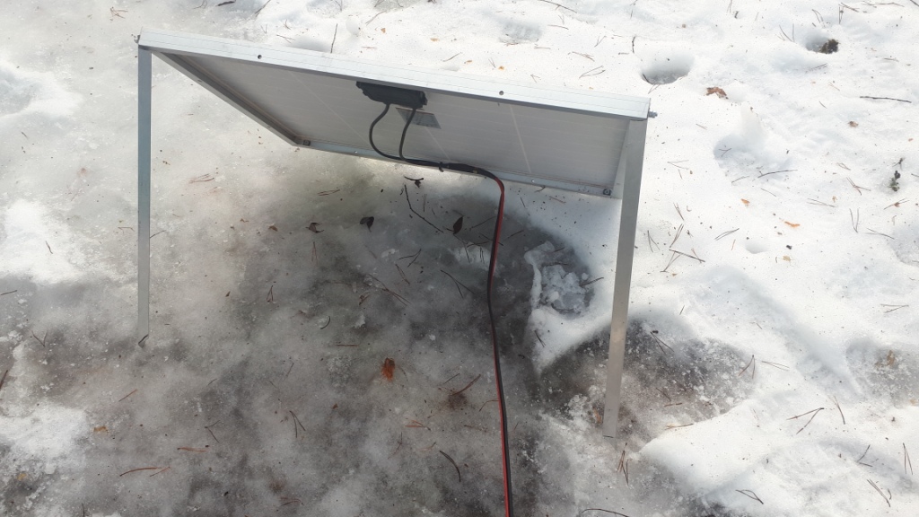 Была куплена на пробу солнечная панель на 50 ватт и простенький контроллер. К панели прикручены складывающиеся ножки и 6 метров проводов, из двп скрутил чехольчик для перевозки.