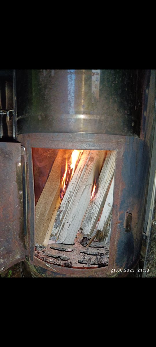 дровину к штакетинам, хамам сразу сделать не получилось. Паробомба и от таких скудных дровишек покраснела и начала нагонять жар. Пришлось сливать кипяток и заливать холодную воду.