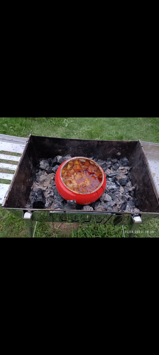 После приготовления шашлыков остались угли и я не мог это не использовать. Жена оставила немного некрупно порезанного мяса, почистила, порезала картошки с овощами. Поставил в эти угли горшочек с разными ингредиентами и через 3 часа уже лакомились блюдом- А ля жаркое. P.S. Мясо осталось поэтому на следующий день сделали ещё несколько шампуров. Ну тут уже можно было отвести душу, целый час переворачивала.