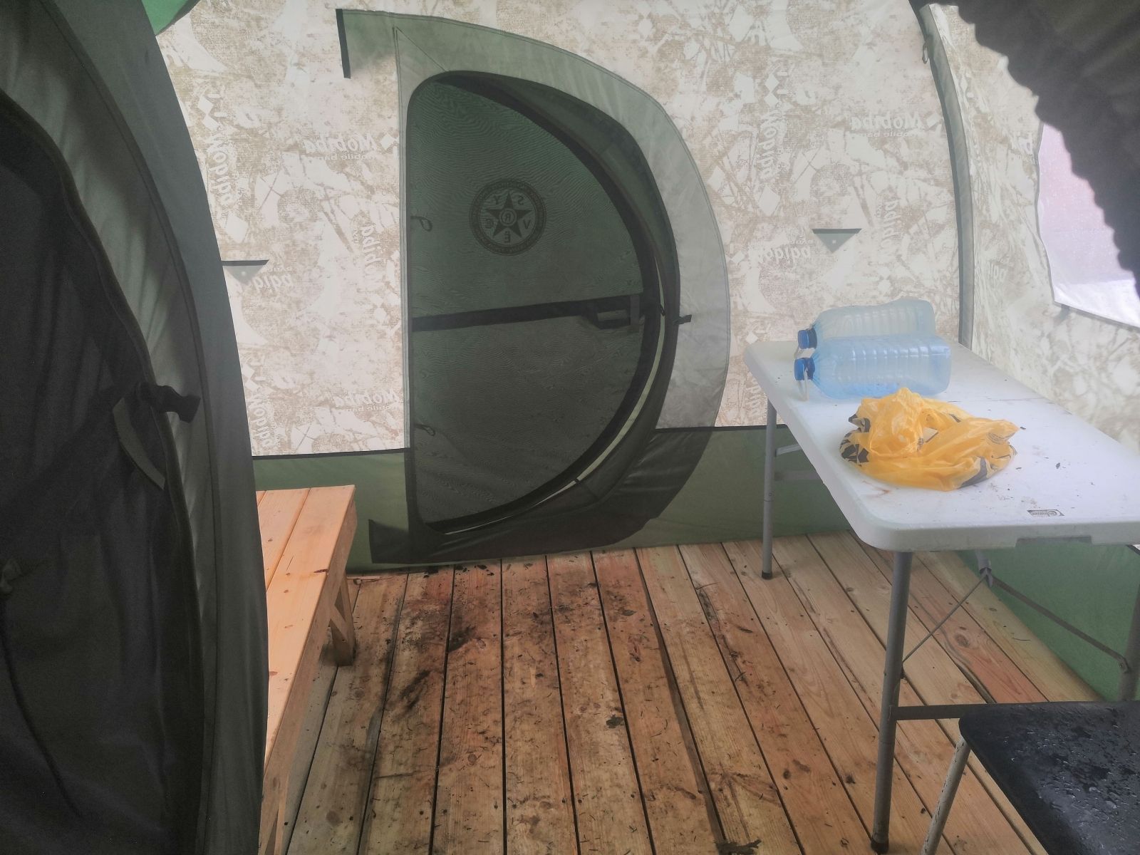 Стоит палатка на деревянном подиуме круглосуточно и дальше планируется круглогодичное использование.