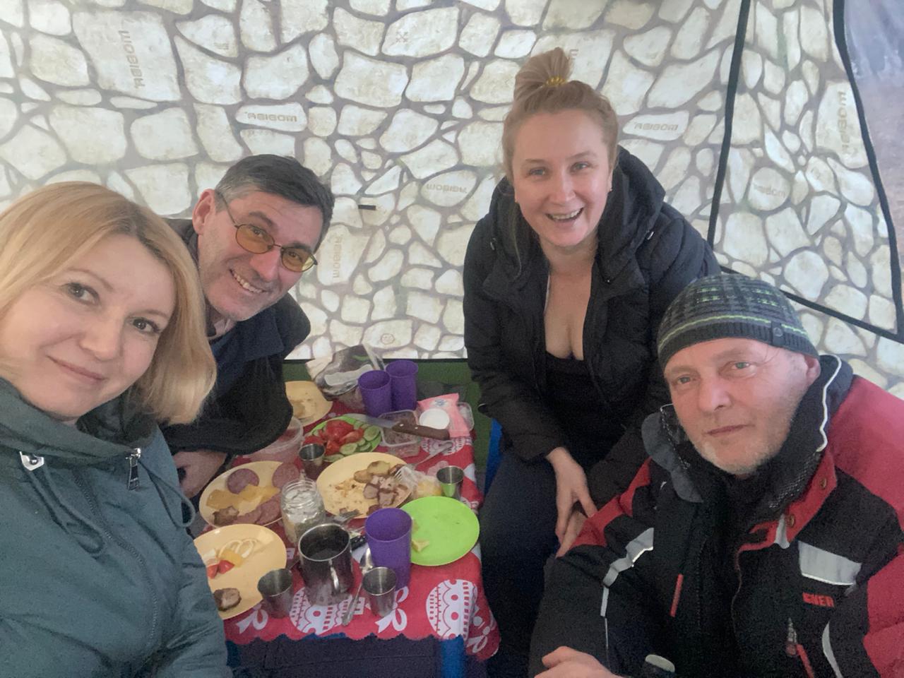 В шикарном стационаре у друзей мы парились вчера, а сегодня двинули в лес на нашу поляну. Жена захотела мяса с Шикардоса. Снег частично сошёл, солнце пригревает. После обеда плюс, и до 17 часов можно сидеть на улице.