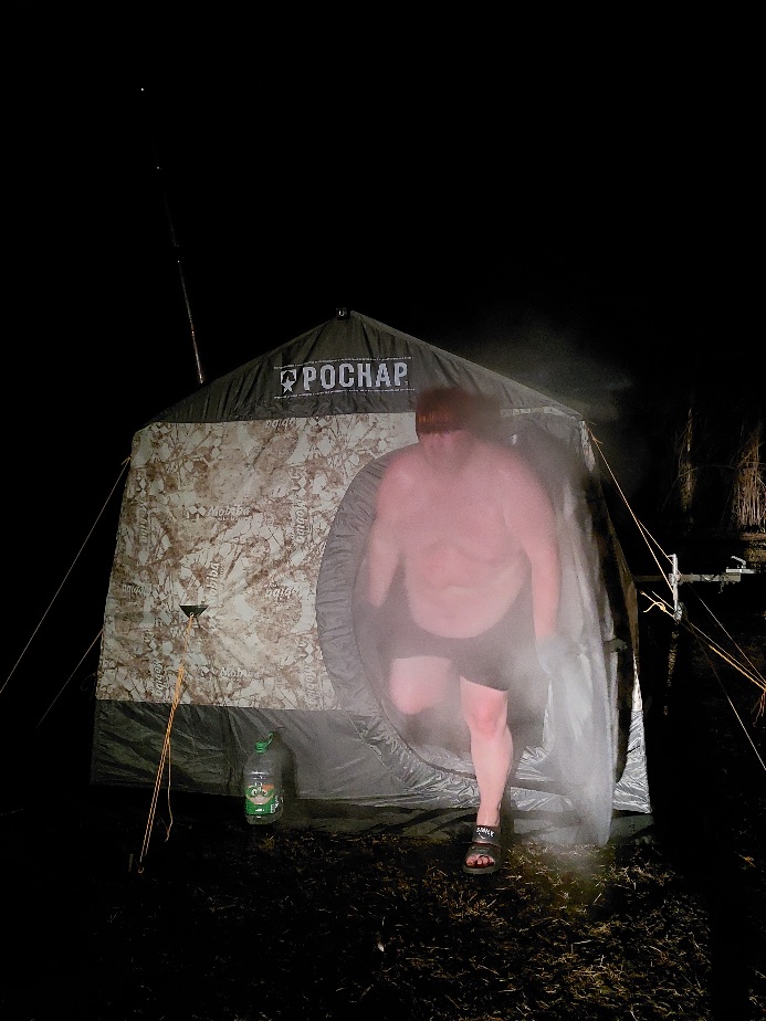 Пока снега мало, обходимся обливанием водой. Стоят ведра на улице))) очень бодрит и так смешно на одетого соседа смотреть, который морщится при каждом выливании воды на себя)))