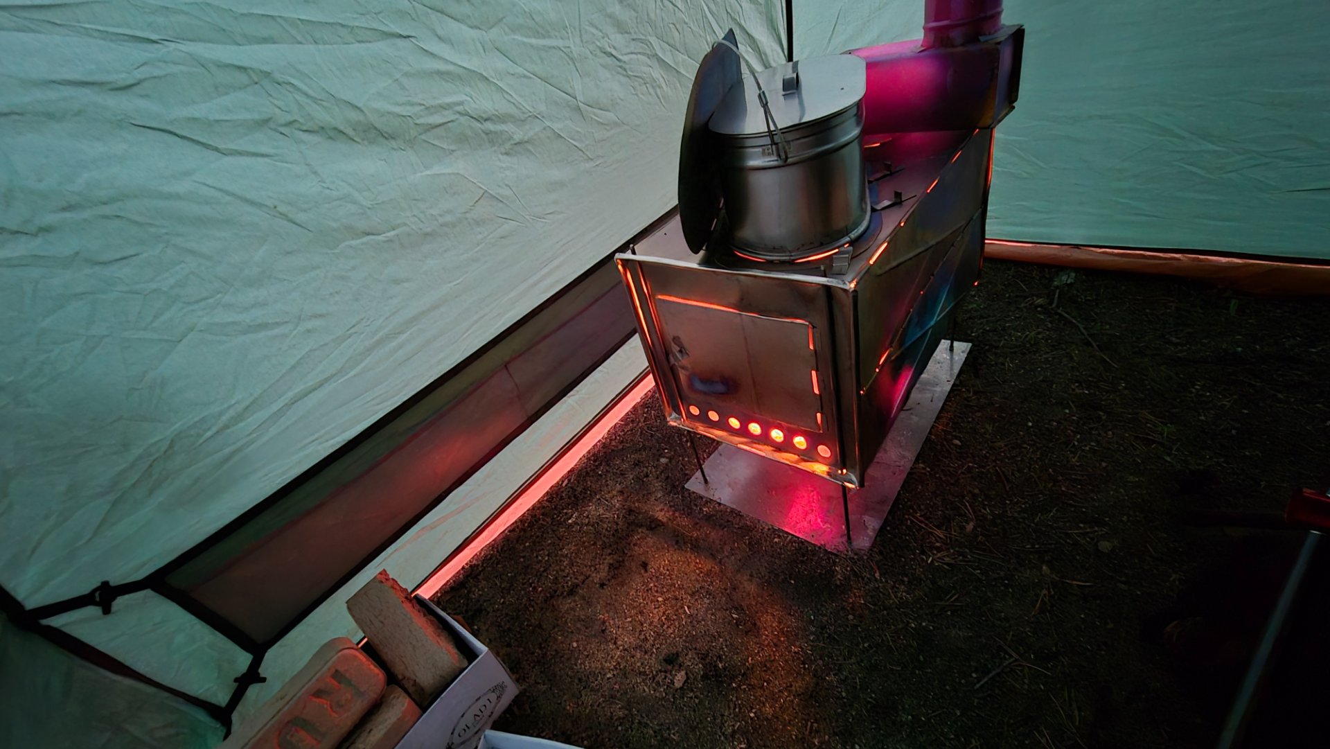 Я боялся что из за теплоотдачи титана мощность печи сильно упадёт, и она не прогреет палатку. Мои опасения были напрасны. Топка в 2 раза стала больше, больше чем у печки Жига, и думаю не меньше чем у печи Гравицапа. На 3х руф брикетах хватает попариться в несколько заходов.