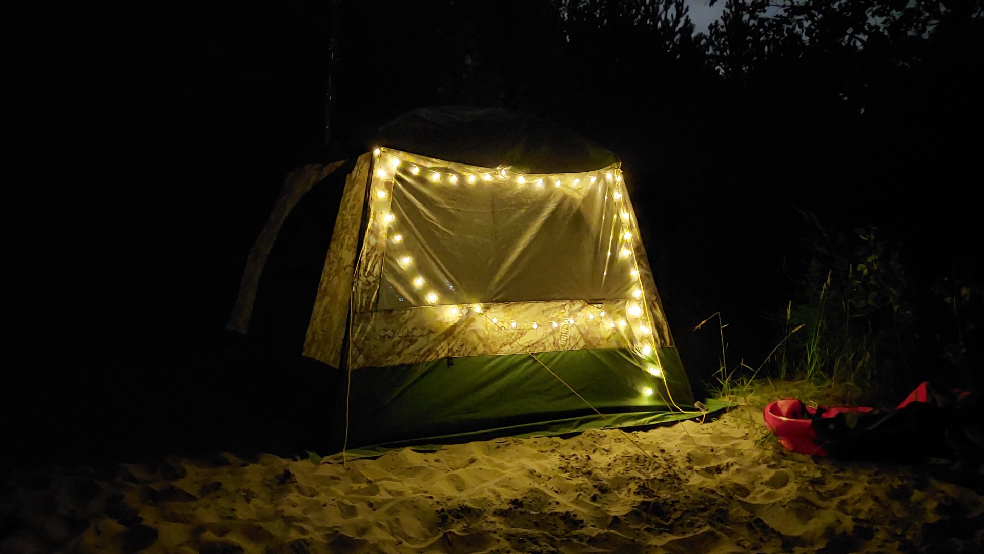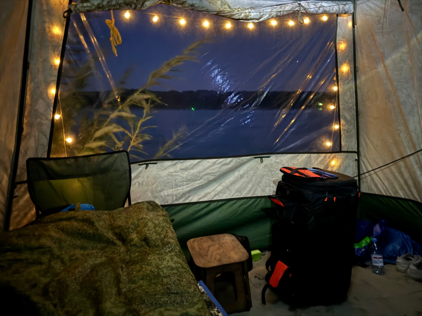 Это пятница, 13 сент 2024 и ночевочка в МБ15А. В лодке дизельного фена с баком хватило на 6 ночевок (запас соляры не брал), и в ход пошла Мобиба. Вместо кровати два ПСН400 бок о бок и стульчик.