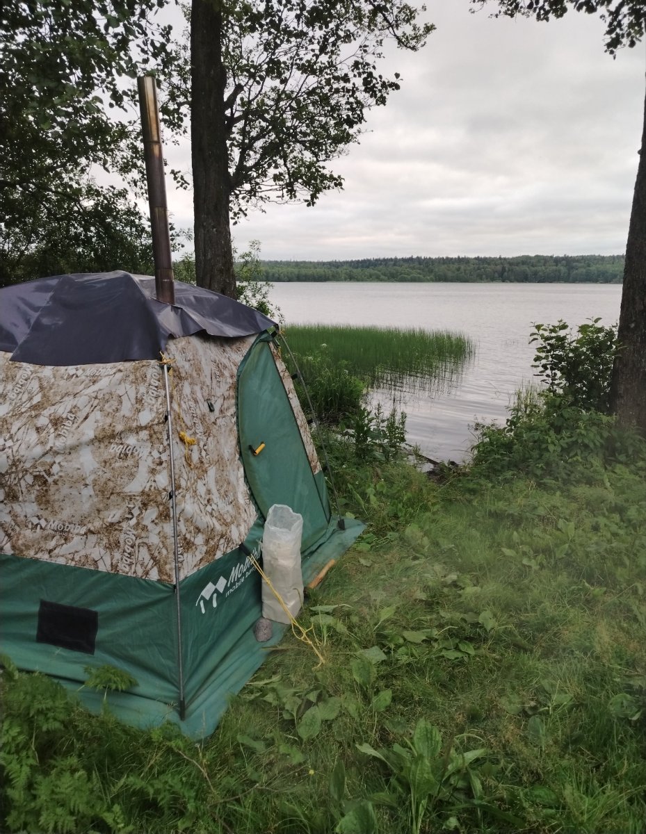 На улице конец июня, в ленобласти льют дожди, погода не летняя, решили с другом на рыбалку с ночёвкой поехать, обязательно с собой берём баню, грузим все в ниву и вперёд. Приехали на место разложились и часок на рыбалку, поймали немного щук на жарку и обратно в лагерь. Начал идти мелкий дождь, потом перестал, погода была сырая. Затопил печь в моей самодельный палатке и друг сразу оценил палатку с печью, что в ней можно вещи сушить. Сказал, что пожалел, о том что не купил к-6 когда я ему предлогал, денег пожалел. Ну теперь у меня сушится будет. Баня была замечательная, напарились, намылись и спать. Утром сборы и домой.