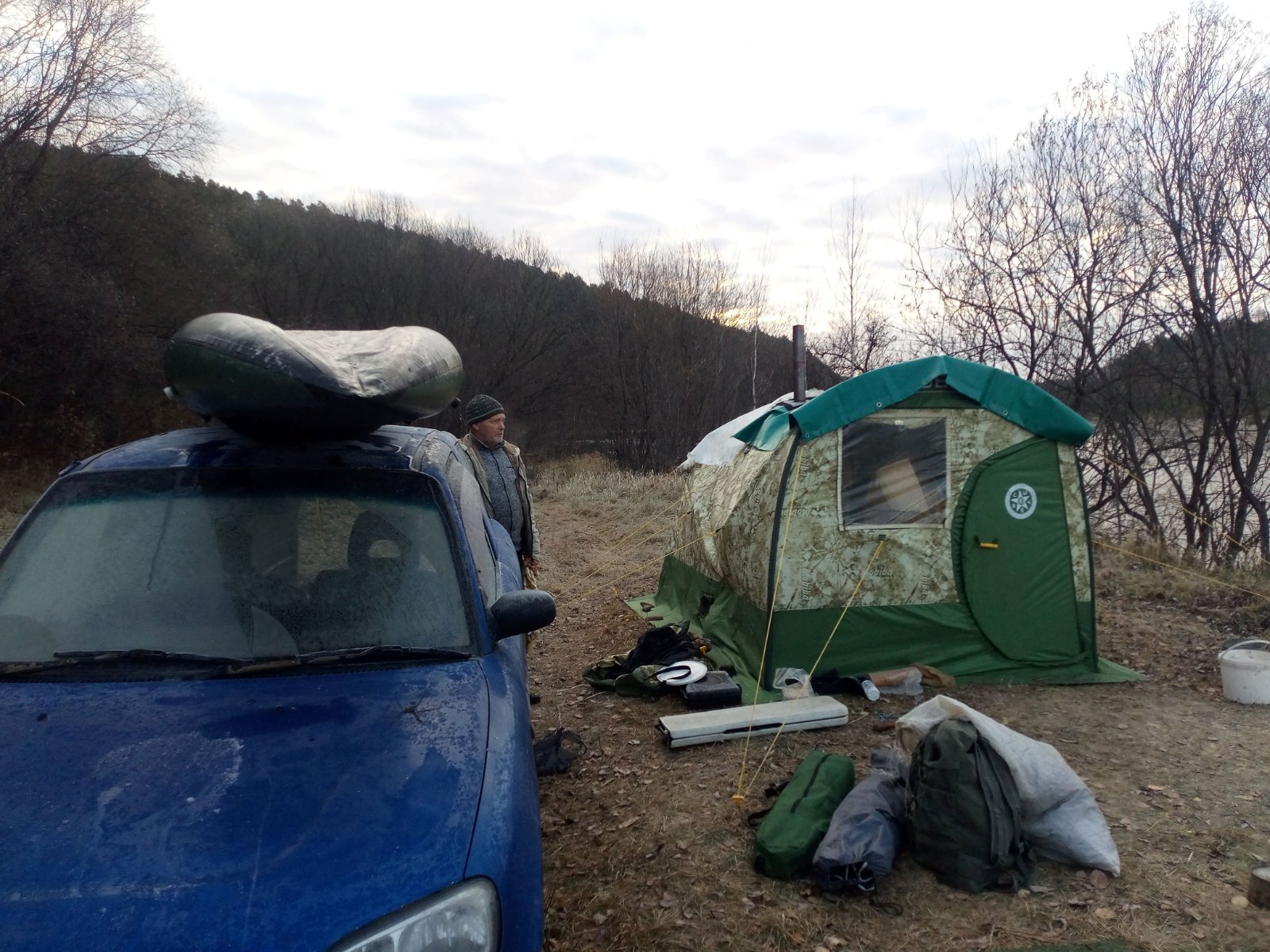 Утром сантиметровый слой льда на машине и лодке, и примерно такой же на тыльной стороне тента.