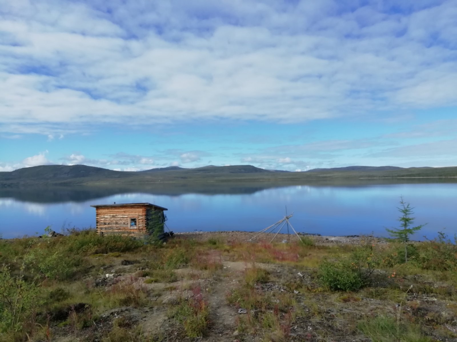Иду на своём пакрафте-каяке со снастью. Наш мобиба-лагерёк остался позади - его ещё видно.
