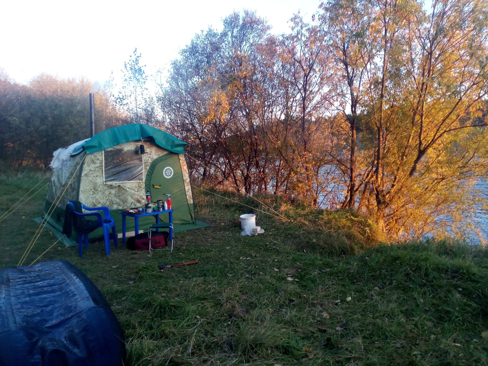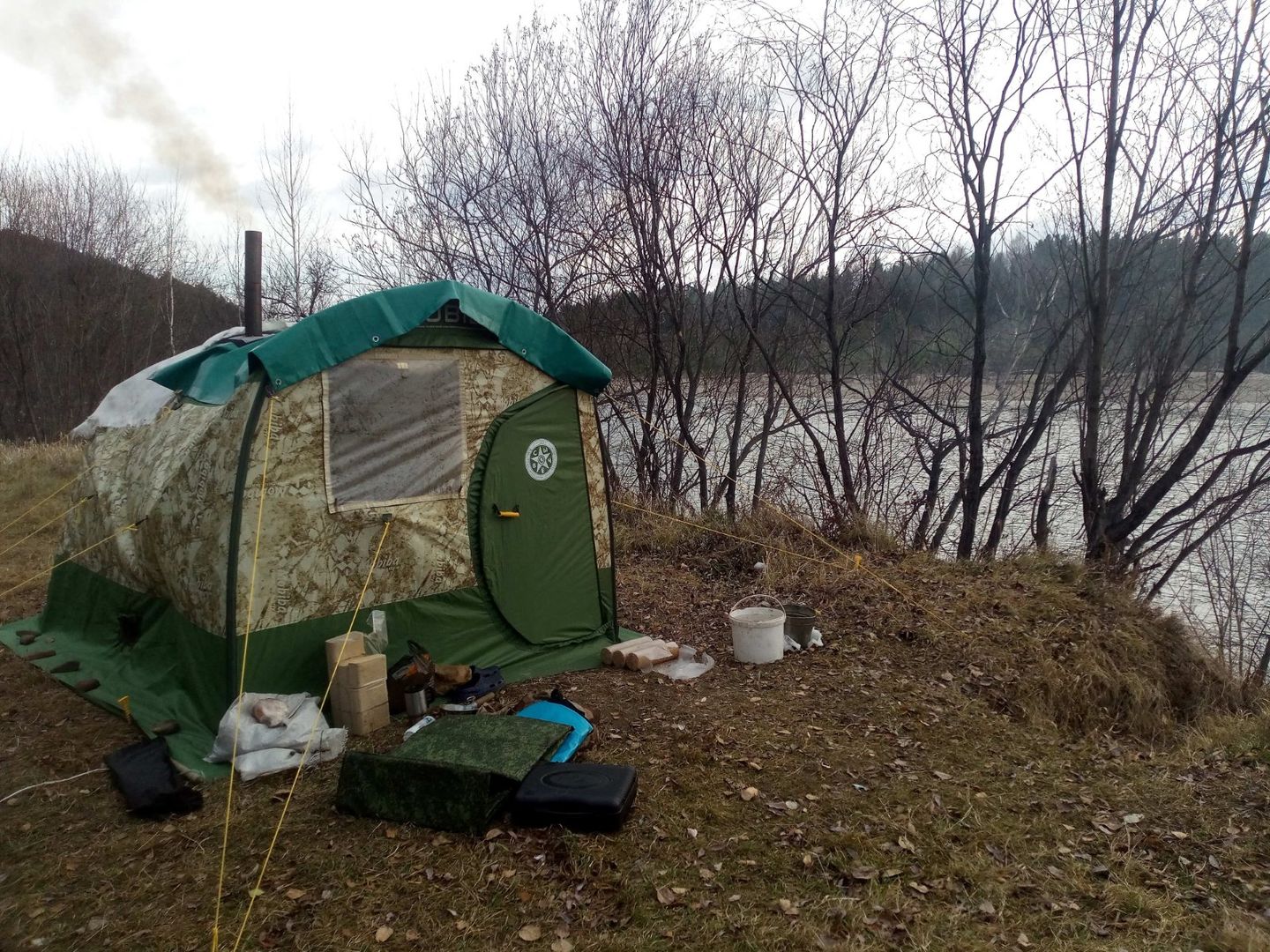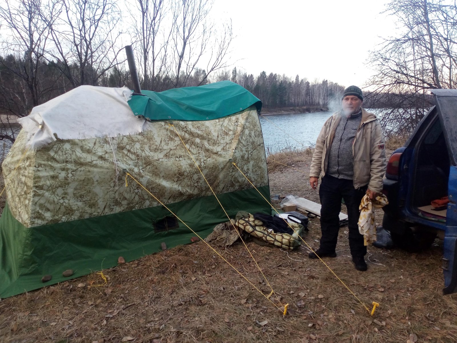 По реке уже плывут льдины. К5 с тентом и печь Дюна-3. Супер комплект для двух экономных рыбаков. В первую очередь по топливу. С тёплым полом на баню и ночёвку у нас уходит всего 2 упаковки брикетов. В очередной раз хочу похвалить эти брикеты. В бане было под сотку, а на ночь хватило пол упаковки, а именно две с половиной цилиндра. Купаться не планировали, т.к. вода ломит ноги и зубы, а мы старые и больные, но после третьего захода занырнули.