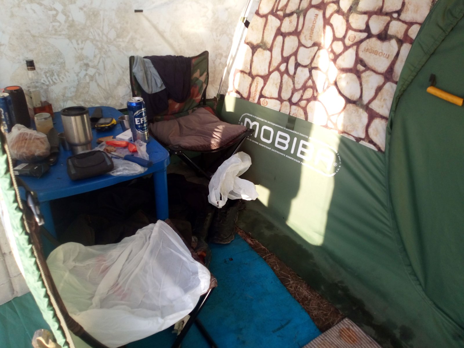 Утром сантиметровый слой льда на машине и лодке, и примерно такой же на тыльной стороне тента. Немножко взяли, на коптилку хватило.