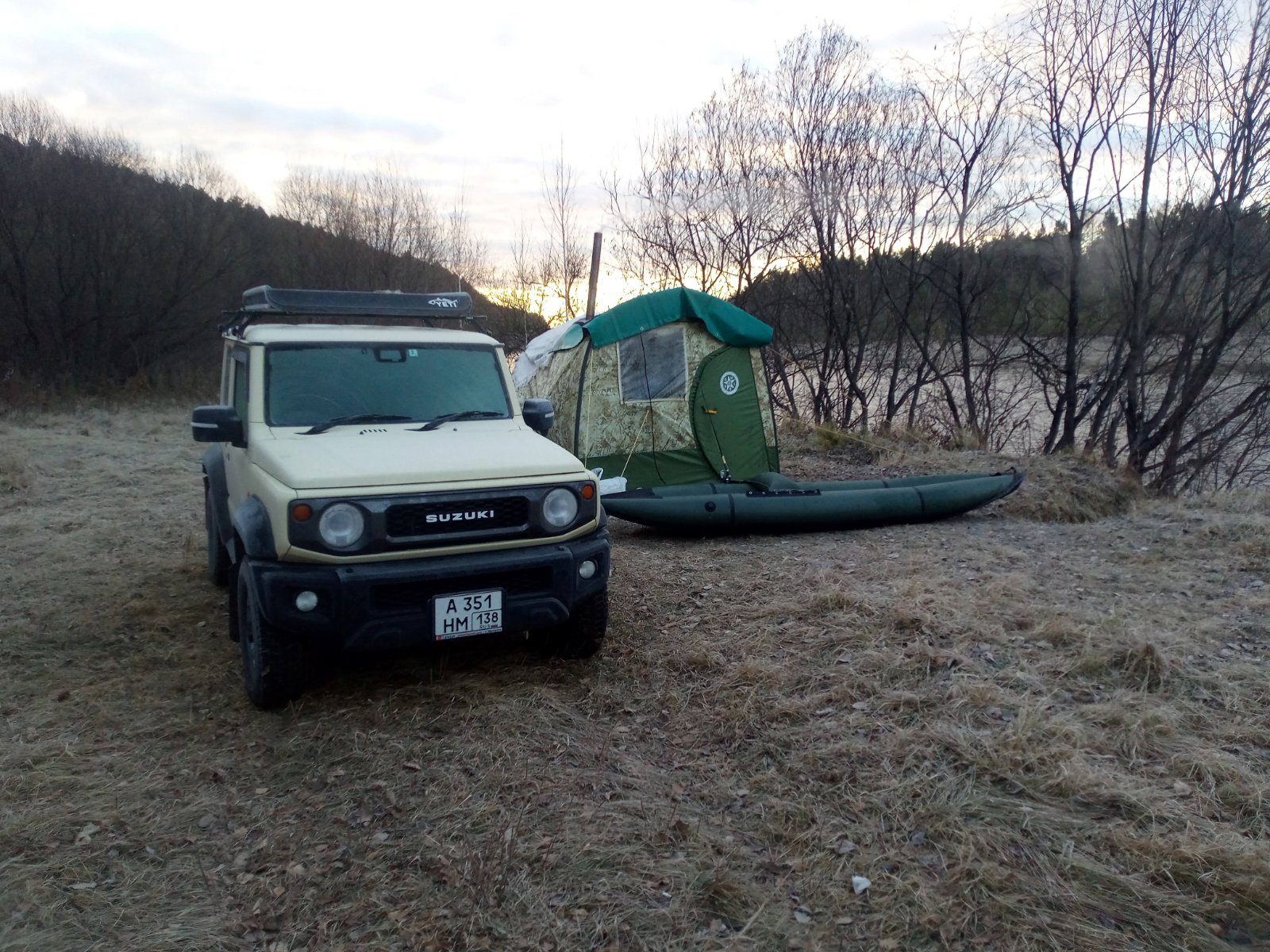 Закончил работу в обед, на следующий день выходной. Надо успевать. Наспех собрался в гараже, взял тёплый пол, но забыл очень важную вещь - тент к Кайфандре. Выяснилось это уже на берегу в 56 км от дома (место Кекурки).