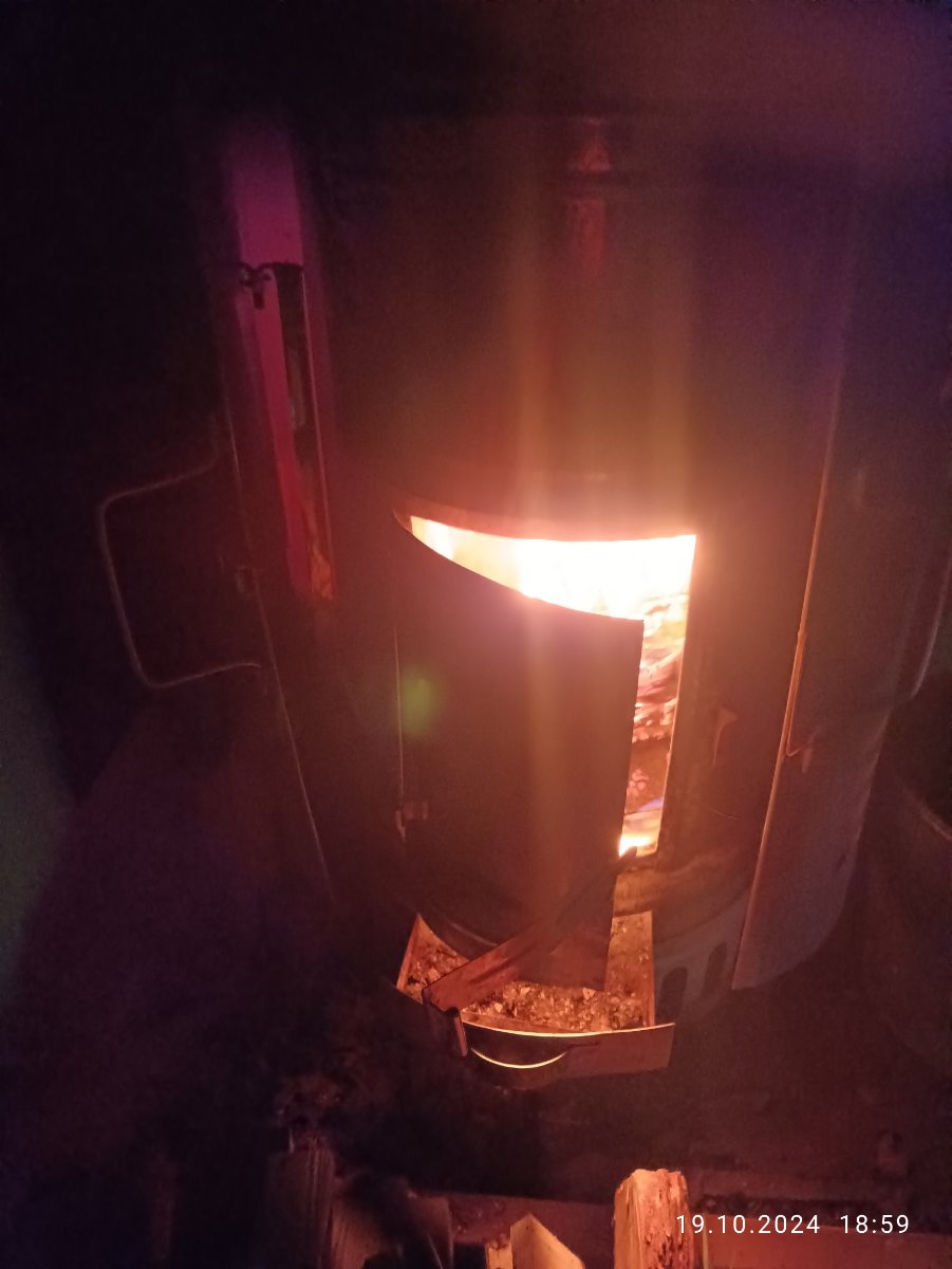 Паллеты сухие, так что горят весело, стоит приоткрыть дверь, пламя вырывается наружу.
