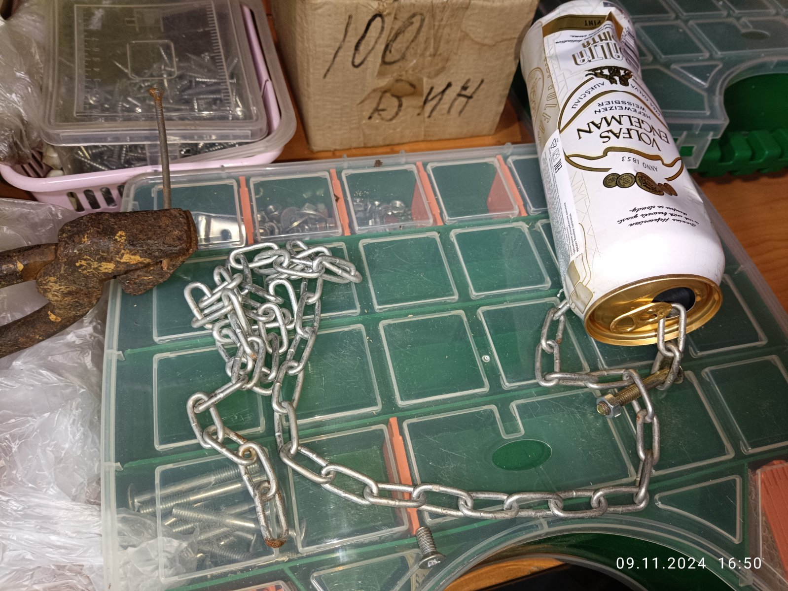 Всё было сделано на скорую руку и из того что лежало на виду в мастерской. Сделал сбоку треугольное отверстие канцелярским ножом в банке из под пива, продел кусок цепи в это отверстие, закрепил цепь болтиком, с другой стороны продел цепь через ручку печи и закрепил согнутым гвоздём и всё.