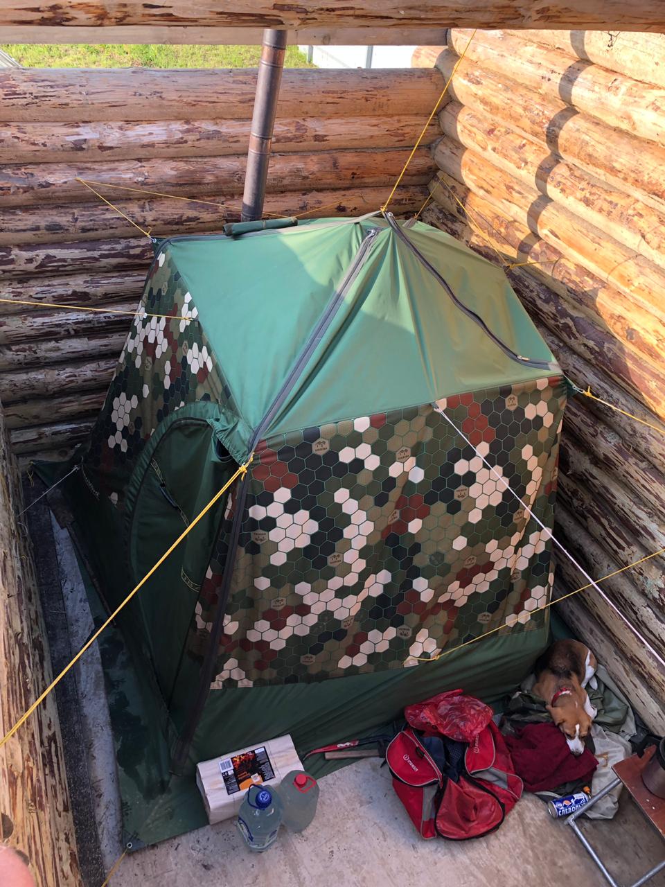Здравия желаю Мобиба Гвардия. Случилось так что я приехал к товарищу помочь собрать сруб бани на фундаменте, но и естественно с банькой в богажнике. Вот только вечером выяснилось что я забыл дуги от 10 на болконе :(. Пришлось ставить баню внутри бани!