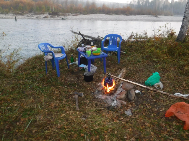 По рыбалке средненько. Я рыбачил со стула, естественно не поймал ни одной. Товарищ обловил все ближайшие плёсы и за два дня взял около двух десятков небольших хариусов. Ни один ленок на блесну не взял.